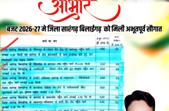 सारंगढ़-बिलाईगढ़- जिले की लंबे समय से जर्जर और बदहाल पड़ी सड़कों को आखिरकार बड़ी राहत मिली है। बजट वर्ष 2026-27...