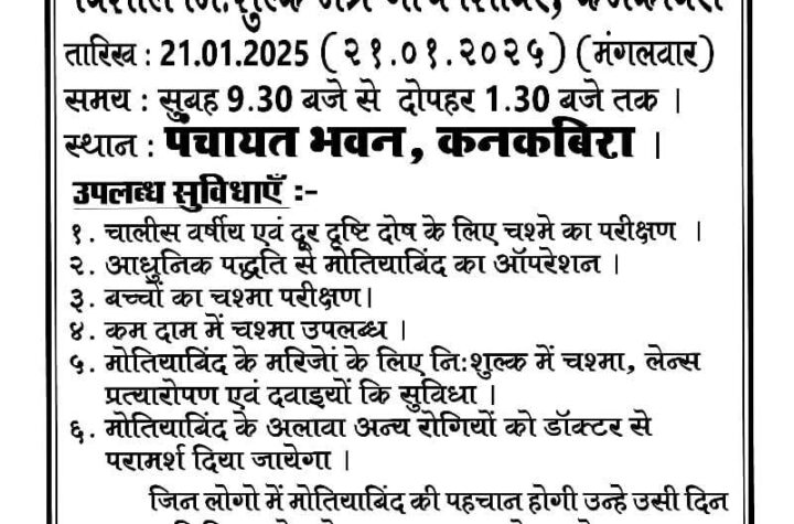 सारंगढ़। सारंगढ़ बिलाईगढ़ जिले के कनकबीरा में 21 जनवरी को सुबह साढ़े 9 बजे से 1 बजे तक निःशुल्क नेत्र...