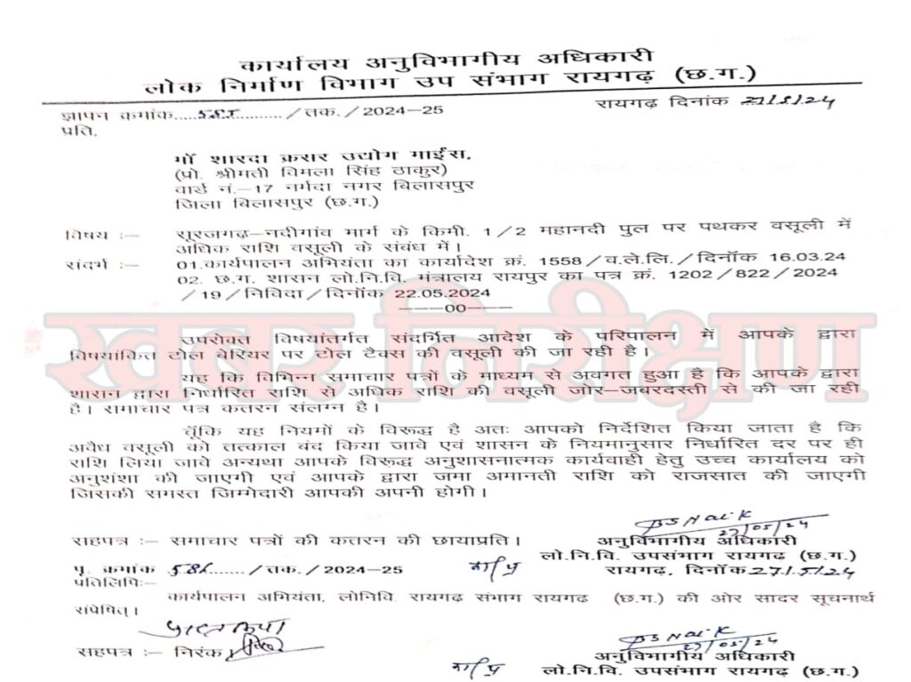 लोकनिर्माण विभाग ने पत्र में लिखा है शासन द्वारा निर्धारित राशि से अधिक राशि वसूली जोर जबर्दस्ती से किया जा रहा है चुकी यह नियमों के विरुद्ध है अतः आपको निर्देशित किया जाता है कि अवैध वसूली को तत्काल बंद किया जावे एवं शासन के नियमानुसार निर्धारित दर पर ही राशि लिया जावे अन्यथा आपके विरुद्ध अनुशासनत्मक कार्यवाही हेतु उच्च कार्यलय को अनुषंसा की जाएगी एवम आपके द्वारा जमा अमानती राशि को राजसात की जाएगी जिस तरह से पत्र जारी किया गया है उससे साफ जाहिर होता है कि विभाग द्वारा ठेकेदार को मौन सहमती और संरक्षक में अवैध वसूली किया जा रहा है होगा जैसे पत्र में प्रतीत होता है नोटिस के नाम मात्र एक खाना पूर्ति है लोगो का ध्यान भटकाने के लिए दिया गया होगा टोल बेरियर में टोल टैक्स सूरजगढ़ पुल नदी में सैकड़ो ट्रक से वसूली किया जा रहा है वहा पर धड़ल्ले से चल रहा है आखिर क्यों विभाग उसे नजर अंदाज कर रहा ? या जानबूझकर ठेकेदार को बचाने में लगे है ? ठेकेदार तो लाखो की वसूली कर जेब में डाल गया और पीडब्ल्यूडी विभाग रायगढ़ ने ऐसे वसूली बाज ठेकेदार पर कार्यवाही किया जाएगा ?