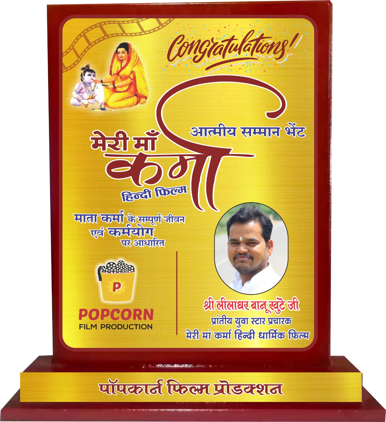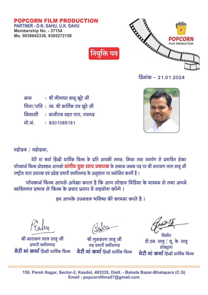 रायगढ़- धार्मिक फि़ल्म मेरी माँ कर्मा के स्टार प्रचारक के लिए पॉपकॉर्न फि़ल्म प्रोडक्शन मुंबई के फि़ल्म प्रोड्यूसर डॉ. श्री डी.एन. साहू, श्री यू.के.साहू, राष्ट्रीय संयोजक एवं मध्यप्रदेश तेलघानी बोर्ड के अध्यक्ष रविकिरण साहू और राष्ट्रीय प्रचारक एवं प्रदेश प्रभारी श्री गुलाब सिंह गोल्हानी व श्री जगराम लक्ष्में राष्ट्रीय कोऑर्डिनेटर जी के द्वारा समाजसेवी लीलाधर बानू खुंटे जी को प्रांतीय स्टार प्रचारक के रूप नियुक्त किया है।