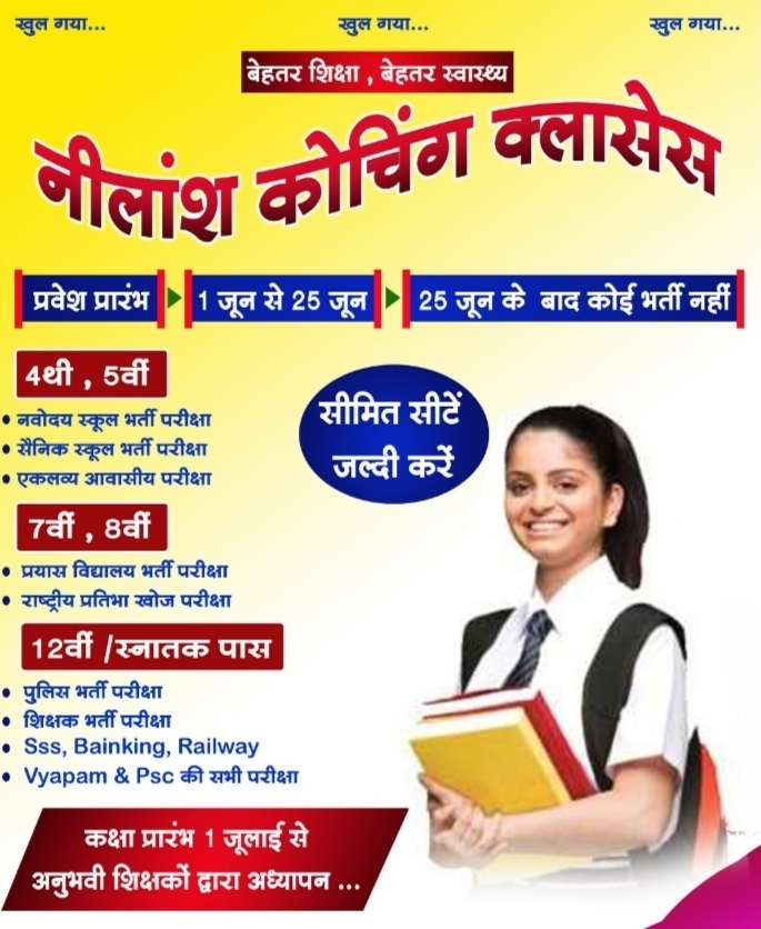 महासमुंद जिला के बसना ब्लॉक के अंतर्गत सागरपाली अंचल के ग्रामीण क्षेत्रों के बच्चों के उज्जवल भविष्य के लिए पहली बार इस क्षेत्र में निलांश कोचिंग क्लासेस का सुभारंग किया जा रहा है,जिसमे प्रवेश के लिए भर्ती प्रक्रिया का प्रारंभ 1 जून 2024 से हो गया है एवं 25 जून 2024 तक भर्ती प्रक्रिया चलेगी(सीमित सीटें )और 25 जून 2024 के बाद कोई भर्ती नही होगी l