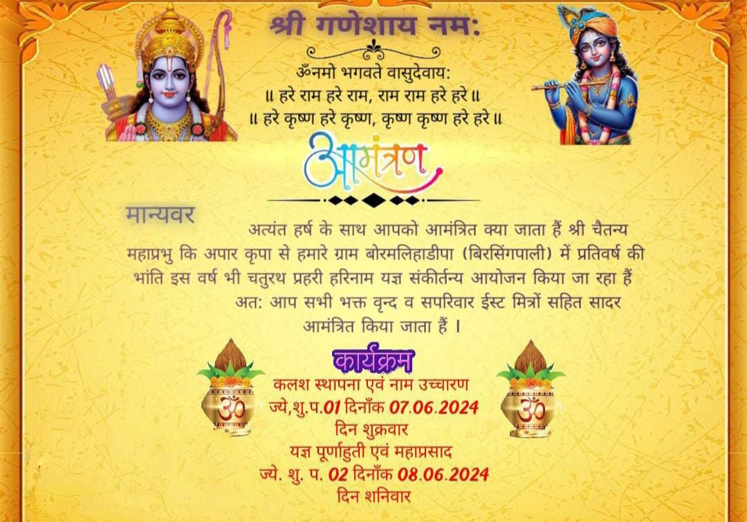 महासमुंद जिला के बसना ब्लॉक के अंतर्गत ग्राम बोरमलिहाडीपा(बिरसिंगपाली)आगामी दिनांक 7 जून 2024 और 8 जून 2024 को प्रति वर्ष की भाती इस वर्ष भी अष्टप्रहरी नामयज्ञ संकीर्तन का आयोजन किया जा रहा है l