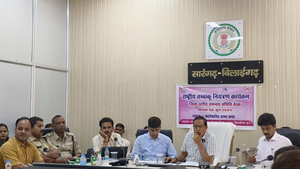 सारंगढ़ बिलाईगढ़, 6 जून 2024/कलेक्टर धर्मेश कुमार साहू की अध्यक्षता में कलेक्ट्रेट सारंगढ़ के सभा कक्ष में राष्ट्रीय तंबाकू नियंत्रण कार्यक्रम अंतर्गत अंतर्विभागीय जिला स्तरीय समन्वय समिति की बैठक आयोजित किया गया। सभी विभाग के जिला प्रमुख अधिकारियों के मध्य मुख्य चिकित्सा एवं स्वास्थ्य अधिकारी डॉ अवधेश पाणिग्राही ने तंबाकू एवं अन्य तंबाकू उत्पाद के सेवन से होने वाली हानि एवं इससे सुरक्षा का एकमात्र उपाय समाज को तंबाकू मुक्त रखना बताया । डॉ इंदु सोनवानी जिला नोडल अधिकारी (तंबाकू नियंत्रण कार्यक्रम) ने समन्वय समिति की बैठक में कोटपा एक्ट के विभिन्न धाराओं के तहत तंबाकू एवं इसके अन्य उत्पाद के क्रय-विक्रय, 18 वर्ष से कम उम्र के लोगों को क्रय-विक्रय में सम्मिलित करने, सार्वजनिक स्थलों पर बिक्री, विज्ञापन प्रदर्शित करने एवं सेवन करने तथा तय सीमा से अधिक भंडारण करने इत्यादि पर की जाने वाली कानूनी कार्यवाही की विस्तृत जानकारी दी। बैठक में कलेक्टर धर्मेश कुमार ने जिला एवं विकासखंड स्तर पर गठित प्रवर्तन दल के माध्यम से नियमित रूप से छापामार कार्रवाई करने, जिले के कार्यालय एवं स्कूलों, ग्रामीण और नगरीय क्षेत्र को तंबाकू मुक्त बनाने हेतु आवश्यक कदम उठाने के निर्देश दिए। बैठक में जिला के पुलिस अधीक्षक पुष्पक शर्मा, अनुविभागीय अधिकारी (राजस्व) सारंगढ़ वासु जैन सहित जिला प्रशासन के सभी प्रमुख अधिकारी एवं सभी विभाग के जिला प्रमुख उपस्थित थे।