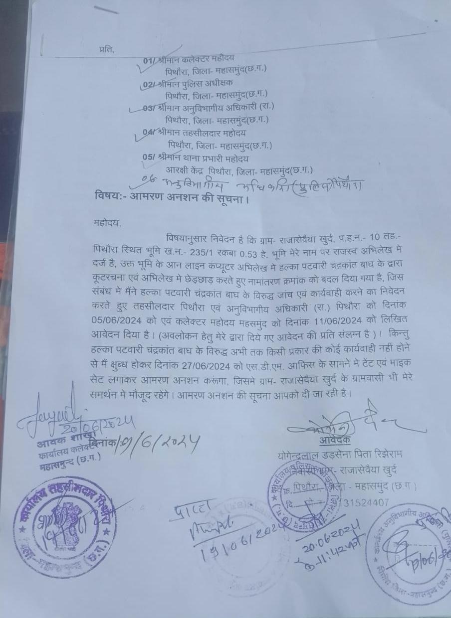 पूरा मामला निजी जमीन अभिलेख में पटवारी द्वारा कुटरचना करने का आरोप लगाते हुए किसान एस.डी.एम कार्यालय के पास आमरण अनशन बैठने का सूचना आवेदन प्रशासन को दिया है अपने आवेदन में किसान द्वारा बताया गया कि ग्राम-राजासेवैया खुर्द, प.ह.न.-10 तह.-पिथौरा स्थित भूमि ख.न.-235/1 रकबा 0.53 है.भूमि मेरे नाम पर राजस्व अभिलेख में दर्ज है, उक्त भूमि के आन लाइन कंप्यूटर अभिलेख में हल्का पटवारी चंद्रकांत बाघ के द्वारा कूटरचना एवं अभिलेख में छेड़छाड़ करते हुए नामांतरण क्रमांक को बदल दिया गया है,जिस संबंध में मैंने हल्का पटवारी चंद्रकांत बाघ के विरुद्ध जांच एवं कार्यवाही करने का निवेदन आवेदन करते हुए तहसीलदार पिथौरा एवं अनुविभागीय अधिकारी (रा.)पिथौरा को दिनांक 05/06/2024 को एवं कलेक्टर महासमुंद को दिनांक 11/06/2024 को किन्तु हल्का पटवारी चंद्रकांत बाध के विरुद्ध अभी तक किसी प्रकार की कोई कार्यवाही नहीं होने से मैं क्षुब्ध होकर दिनांक 27/06/2024 को एस.डी.एम.आफिस के सामने में आमरण अनशन ग्रामीणों के साथ करूंगा का आवेदन किया है l