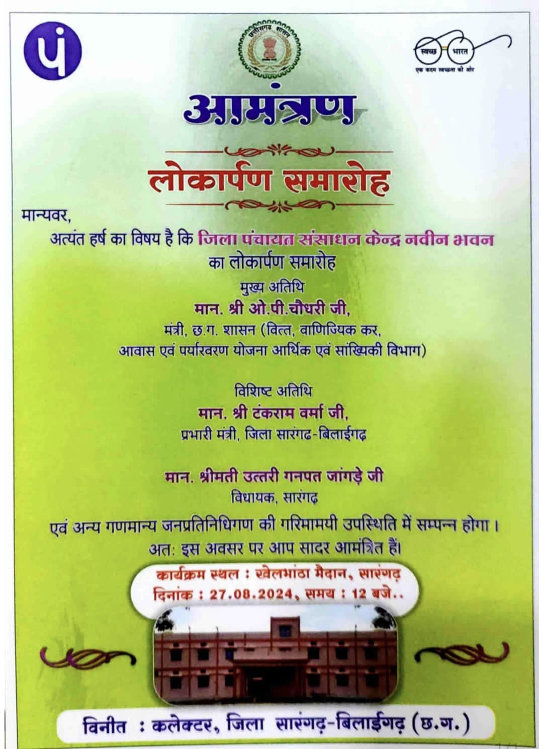 सारंगढ़ बिलाईगढ़, 25 अगस्त 2024/ सारंगढ़ बिलाईगढ़ जिले में शीघ्र ही जिला पंचायत का गठन भी हो जायेगा, जिसका अधिसूचना प्रकाशन जारी हो चुका है। यह खुशी की बात है कि जिला पंचायत के अस्तित्व में आने के पूर्व स्वयं का भवन तैयार हो गया है,जिसका जिला पंचायत संसाधन केंद्र नवीन भवन सारंगढ़ का लोकार्पण होने जा रहा है। कार्यक्रम के मुख्य अतिथि ओपी चौधरी मंत्री, छत्तीसगढ़ शासन वित्त वाणिज्य कर , आवास एवं पर्यावरण योजना आर्थिक एवं सांख्यिकी विभाग, विशिष्ट अतिथि के आसंदी पर जिले के प्रभारी मंत्री टंकराम वर्मा एवं विधायक सारंगढ़ उत्तरी जांगड़े की गरिमामय उपस्थिति में खेलभांठा मैदान कार्यक्रम स्थल सारंगढ़ में 27 अगस्त 2024 को दोपहर 12 बजे होने जा रहा है। सारंगढ़ बिलाईगढ़ जिला कलेक्टर धर्मेंद्र साहू ने आम व खास सभी से निवेदन किये है कि इस भवन के लोकार्पण समारोह के मधुर बेला में अधिक संख्या में उपस्थित होकर कार्यक्रम को सफल बनाएं।