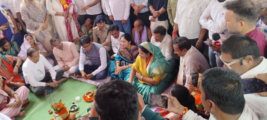 लोकार्पण समारोह में वित्त मंत्री चौधरी, राज्यसभा सदस्य देवेन्द्र प्रताप सिंह सहित अन्य अतिथियों का स्वागत स्थानीय नृतक दलों की ढोल मंजीरा और बिहान स्वसहायता समूहों की महिलाओं के द्वारा पुष्प वर्षा और तिलक लगाकर कर किया गया। सभी अतिथिगण भवन के लोकार्पण समारोह की पूजा में शामिल हुए