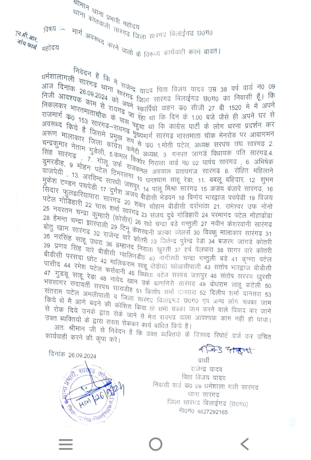 सारँगढ़ – सारँगढ़ में सरपंच संघ व जनपद सदस्यो ने गौण खनिज मद को अनुमोदन नही करने पर कलेक्टर के खिलाफ धरना व चक्का जाम किया गया था मार्ग अवरूद्ध करने के विरूद्ध में राजेन्द्र यादव ने थाना कोतवाली में नामजाद 53 लोगो के ऊपर एफआईआर दर्ज करवाया गया लिखित शिकायत में बताया की दिनांक 26.09.2024 को अपने स्कार्पियो वाहन क्रमांक सीजी 27 बी 1520 में अपने निजी आवश्यक काम से रायगढ़ जा रहा था कि दिन के 1.00 बजे जैसे ही अपने घर से निकलकर भारत माता चौक के पास पहुंचा था कि काग्रेस पार्टी के लोग धरना प्रदर्शन कर आवागमन अवरुध्द किये है जिसमें मुख्य रूप से १.मोती पटेल ,2अरुण मालाकार,3 गनपत जांगड़े ,4,चन्द्रकुमार नेताम, 5 कमल किशोर , 6 अभिषेक सिंह , 7. गोलू उर्फ राजकुमार अग्रवाल , 8 रोहित महिलाने , 9 मोहन पटेल, 10 घनश्याम साहू ,11.बबलू बहिदार 12 शुभम बाजपेयी 13. अरविन्द सारथी 14 पालू मिश्रा, 15 अजय बंजारे 16 मुकेश टण्डन 17 दुर्गेश अजय 18 विनोद भारद्वाज 19 विजय सिदार ,20 शंकर चौहान 21. रामेश्वर उफ नोनो 22 चारु शर्मा 23 संजय दुबे 24 परमानंद पटेल 25 नवरतन चन्द्रा 26 राधे चंद्रा 27 नवीन केशरवानी 28 हेमन्त चन्द्रा 29 टिनू केशरवानी, 30 विक्कू मालाकार 31 बोतु खान 32 राजेन्द्र वारे 33 जितेन्द्र पुराइण 34 बजरंग जांगड़े 35 नरसिंह साहू 36 ब्रम्हानंद निराला 37 हर्ष 38 सागर वारे 39 प्रणव सिंह वारे 40 भागीरथी चन्दा 41 कृष्णा पटेल 42 मालिकराम साहू 43 संतोष भारद्वाज 44 रमेश पटेल 45 विधाता पटेल 46 संतोष सरपच 47 गुड्डू साहू रेडा 48 नावेद खान 49 बोधराम साहू 50 भवसागर सदावर्ती 51 किशोर शर्मा 52 दिलीप शर्मा 53 संतराम पटेल व अन्य साथी सारँगढ़ बिलाईगढ़ छ०ग० एवं अन्य लोग चक्का जाम किये थे मैं आगे बढ़ने की कोशिश किया तो सभी चक्का जाम करने वाले विवाद कर जाने से रोक दिये उनके द्वारा रोके जाने से मेरा रायगढ़ वाला आवश्यक काम नहीं हो पाया। उक्त व्यक्तियो के द्वारा रास्ता रोककर कार्य बाधित किये है ।उक्त व्यक्तियों के ऊपर रिपोर्ट दर्ज कर उचित कार्यवाही करें ।