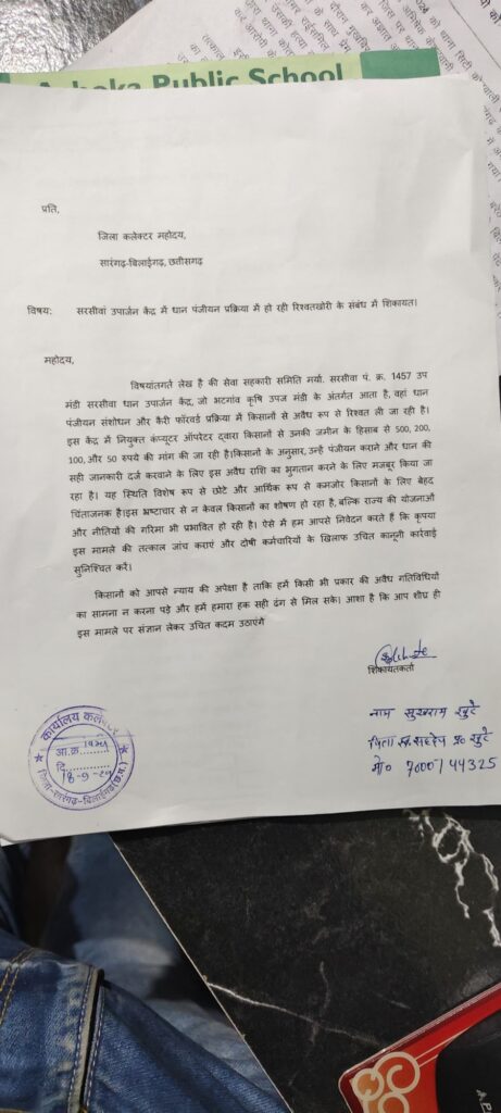सारंगढ़-बिलाईगढ़,: सरसीवां उपार्जन केंद्र में धान पंजीयन प्रक्रिया के दौरान किसानों से अवैध वसूली का मामला सामने आया है। केंद्र में नियुक्त कंप्यूटर ऑपरेटर द्वारा किसानों से उनकी जमीन के आधार पर धान पंजीयन व रकबा संशोधन के लिए 500, 200, 100, और 50 रुपये की रिश्वत ली जा रही है। यह केंद्र भटगांव कृषि उपज मंडी के अंतर्गत आता है, जो जिला सारंगढ़-बिलाईगढ़ में स्थित है।