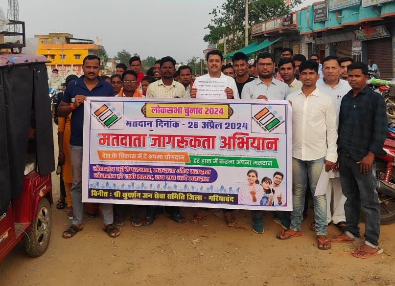 देवभोग – आज श्री सुदर्शन जन सेवा समिति गरियाबंद के तत्वाधान में जिला समिति के सदस्य एवं देवभोग के गणमान्य नागरिको के द्वारा मतदाता जागरूकता रैली निकाली गई जिसमें प्रतिशत मतदान हेतु आग्रह किया गया।यह रैली देवभाेग के जानकी कुंड से निकाल पूरे नगर का भ्रमण किया।रैली ने नारे और स्लोगन के माध्यम से शत प्रतिशत मतदान करने की अपील किया गया।समिति ने नोटा के इस्तेमाल को भी गैर जिम्मेदाराना बताया।विकास के लिए एक वोट की कीमत को समझाने ओर अपने मनपसंद प्रत्याशी को मतदान करने पर समिति ने जोर देते हुए शत शत प्रतिशत मतदान करने की अपील किया है।
