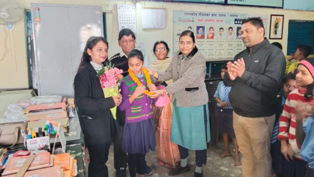 इस शुभ अवसर पर सर्वप्रथम पूर्वी सिंह मरावी व उसके परिजनों ने विद्या की अधिष्ठात्री देवी मां सरस्वती की पूजा -अर्चना किया , तत्पश्चात् पूर्वी सिंह मरावी ने डॉ.मनीषा त्रिपाठी ,प्रधान पाठक प्राथमिक शाला रविशंकर एवं श्रीमती प्रेमलता चंदेल ,प्रधान पाठक माध्यमिक शाला चांदमारी व अन्य शालेय शिक्षकों का चरणस्पर्श कर आर्शीवाद प्राप्त किया। सभी ने छात्रा को शुभाशीष प्रदान कर उसके उज्जवल भविष्य की कामना की एवं उपहार भी भेंट किए।