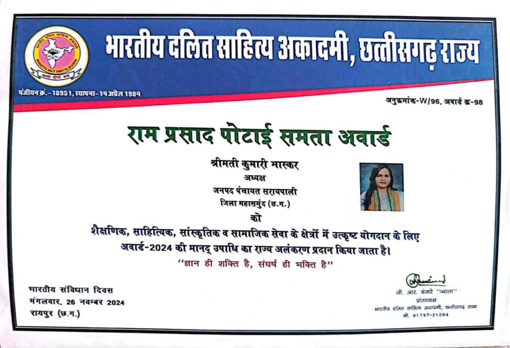 इस अवसर पर कुमारी भास्कर, अध्यक्ष जनपद पंचायत सरायपाली,जिला महासमुंद (छत्तीसगढ़) को”राम प्रसाद पोटाई समता अवार्ड” प्रदान कर सम्मानित किया गया।