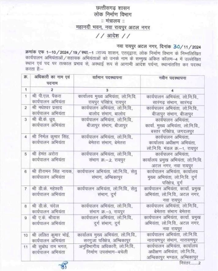 सारंगढ़ बिलाईगढ़ – छत्तीसगढ़ मे लोक निर्माण विभाग के दर्जनों अधिकारी बदले गए सारंगढ़ मे भी कार्यपालन अभियंता (लोक निर्माण विभाग ) बदले गए देखे छत्तीसगढ़ की पूरी सूची