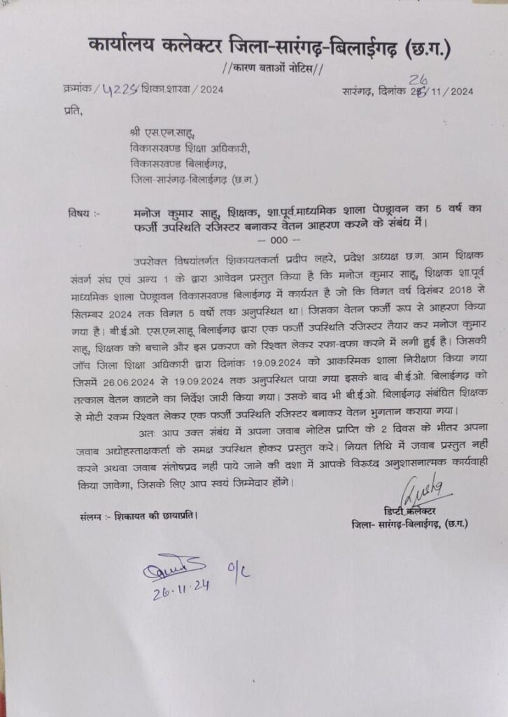 सारंगढ़ बिलाईगढ़ – विगत कुछ महीनों से शिक्षा विभाग और उनके बड़े बड़े अधिकारी लगातार शुरखियो मे है और धीरे धीरे विवादित अधिकारी बनते जा रहे है फिर एक बार शुरखियो मे आ रहे है बिलाईगढ़ BEO आपको बता दे शिकायतकर्ता प्रदीप लहरे, प्रदेश अध्यक्ष छ.ग. आम शिक्षक संवर्ग संघ एवं अन्य 1 के द्वारा आवेदन प्रस्तुत किया है कि मनोज कुमार साहू, शिक्षक शा.पूर्व माध्यमिक शाला पेण्ड्रावन विकासखण्ड बिलाईगढ़ में कार्यरत है जो कि विगत वर्ष दिसंबर 2018 से सितम्बर 2024 तक विगत 5 वर्षो तक अनुपस्थित था। जिसका वेतन फर्जी रूप से आहरण किया गया है। बी.ई.ओ. एस.एन. साहू बिलाईगढ़ द्वारा एक फर्जी उपस्थिति रजिस्टर तैयार कर मनोज कुमार साहू, शिक्षक को बचाने और इस प्रकरण को रिश्वत लेकर रफा-दफा करने में लगी हुई है। जिसकी जॉच जिला शिक्षा अधिकारी द्वारा दिनांक 19.09.2024 को आकस्मिक शाला निरीक्षण किया गया जिसमें 26.06.2024 से 19.09.2024 तक अनुपस्थित पाया गया इसके बाद बी.ई.ओ. बिलाईगढ़ को तत्काल वेतन काटने का निर्देश जारी किया गया। उसके बाद भी बी.ई.ओ. बिलाईगढ़ संबंधित शिक्षक से मोटी रकम रिश्वत लेकर एक फर्जी उपस्थिति रजिस्टर बनाकर वेतन भुगतान कराया गया।