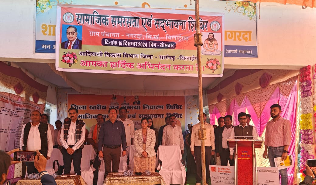 कलेक्टर श्री धर्मेश साहू द्वारा शिविर के संबंध में जनसमूह को संबंधित कर विभाग द्वारा संचालित योजनाओं की जानकारी दी गई और सामाजिक समरसता एवं सद्भावना शिविर के तहत आदिवासी विकास विभाग द्वारा भोजन की व्यवस्था की गई है सभी को भोजन करने की अपील की गई। पुलिस विभाग के अधिकारी द्वारा अत्याचार निवारण के संबंध में विशेष जानकारी दी गई। सहायक आयुक्त आदिवासी विकास श्री बद्रीश सुखदेवे द्वारा सामाजिक समरसता के संबंध में जन समूह को संबोधित किये और बताया गया कि सभी मानव समाज भेदभाव न करते हुए भाईचारा एकता के साथ आगे बढ़ाने की अपील की गई एवं समाज में विकास हेतु विभाग द्वारा विभिन्न योजनाएं संचालित होती है जिसकी सभी लाभ उठाए। धरती आबा के तहत जनजातिय ग्रामों का चिन्ह्यांकन की गई है उक्त ग्रामों में विकास हेतु समुचित कदम उठाने और समुचित लाभ उठाने की अपील गई अंत में सभी जन समूह को एवं अतिथियों को भोजन करने आमंत्रित किया गया अंत में अतिथियों, अधिकारी कर्मचारियों को मोमेंटो प्रदान कर सम्मानित किया गया एवं सांस्कृतिक कार्यक्रम प्रस्तुति करने वाले छात्राओं को मोमेंटो और प्रमाण पत्र से श्री बद्रीश सुखदेवे सहायक आयुक्त द्वारा सम्मानित की गई। मुख्य कार्यपालन अधिकारी जनपद पंचायत बिलाईगढ़ द्वारा आभार किया गया। राष्ट्रगान के साथ कार्यक्रम की समापन की गई।अंत में सभी एक साथ भोजन किए। उक्त कार्यक्रम में श्री हरिशंकर चौहान परियोजना निदेशक, डॉ वर्षा बंसल एसडीएम बिलाईगढ़, जिला शिक्षा अधिकारी श्री एल पी पटेल, महिला एवं बाल विकास अधिकारी श्री बृजेंद्र ठाकुर, समाज कल्याण विभाग के उपसंचालक श्री विनय तिवारी, मुख्य चिकित्सा एवं स्वास्थ्य अधिकारी श्री एफ आर निराला, मुख्य कार्यपालन अधिकारी बिलाईगढ़ श्री प्रतीक प्रधान, श्रीमती संजू पटेल सहायक परियोजना अधिकारी सारंगढ़, तहसीलदार बिलाईगढ़ श्री कमलेश्वर सिदार, विभिन्न विभाग के अधिकारी कर्मचारीगण, प्राचार्य शासकीय उच्चतर माध्यमिक विद्यालय श्री भारती एवम विद्यालय के समस्त स्टाफ, विकासखंड प्रभारी आदिवासी विकास सारंगढ़ श्री विमल कुमार अजगल्ले, बरमकेला से श्री गिरीवर नायक, बिलाईगढ़ से श्री सालिकराम जायसी, समस्त छात्रावास अधीक्षक, ग्राम पंचायत नगरदा के सरपंच श्री धनीराम बंजारे, जनप्रतिनिधिगण, पत्रकारगण, ग्रामवासी, छात्र छात्राएं आदि की उपस्थिति में कार्यक्रम संपन्न हुए। मंच संचालन डॉ आर बी तिवारी और अमित पटेल के द्वारा किया गया।