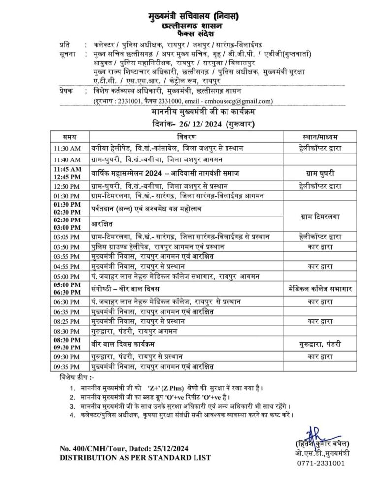 मुख्यमंत्री साय 26 दिसंबर को पर्वत दान (अन्न) और अश्वमेध यज्ञ महोत्सव में शामिल होंगे