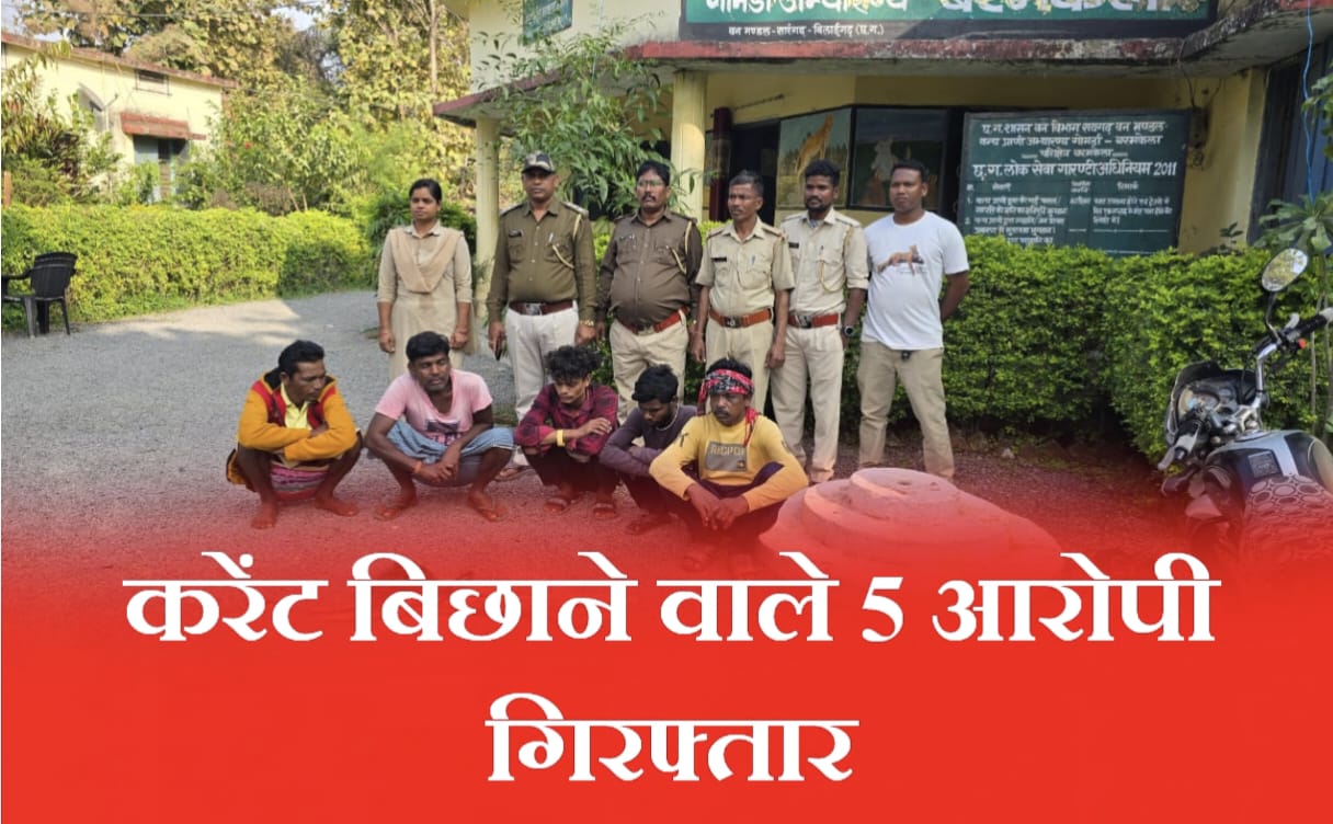 सारंगढ़ – जगली जानवर का शिकार करने बिछाया करेंट, करेंट की चपेट मे आया दो युवक मामले मे 6 आरोपी के नाम सामने आ रहे जिसमे 5 आरोपी को वन विभाग की टीम ने गिरफ्तार कर लिया है एक आरोपी फरार है सभी आरोपी बरमकेला के करनपाली गांव का रहने वाले है