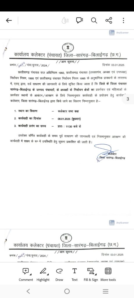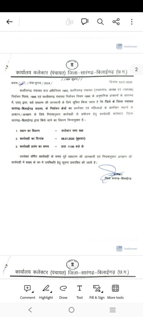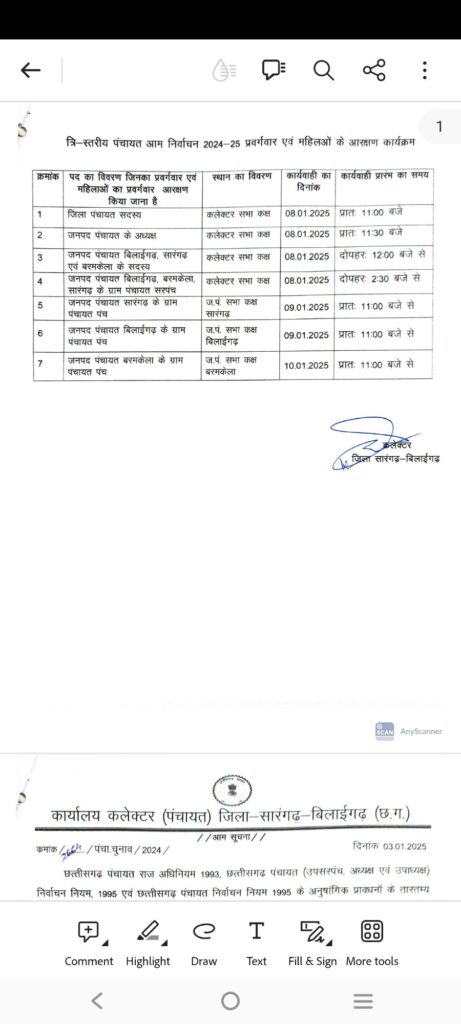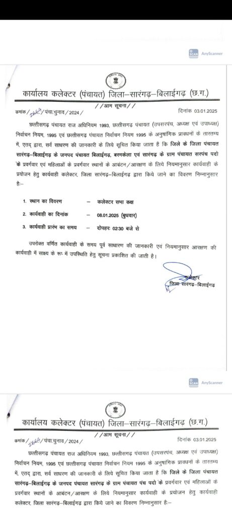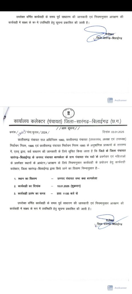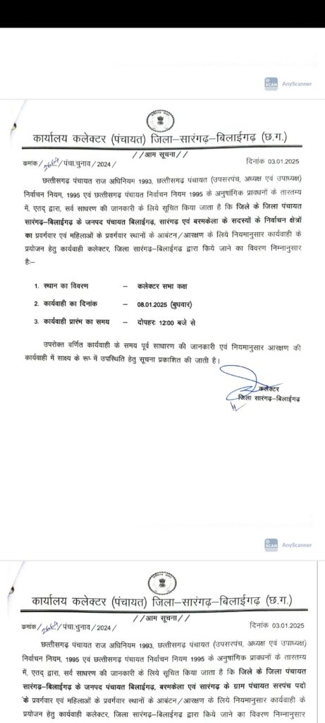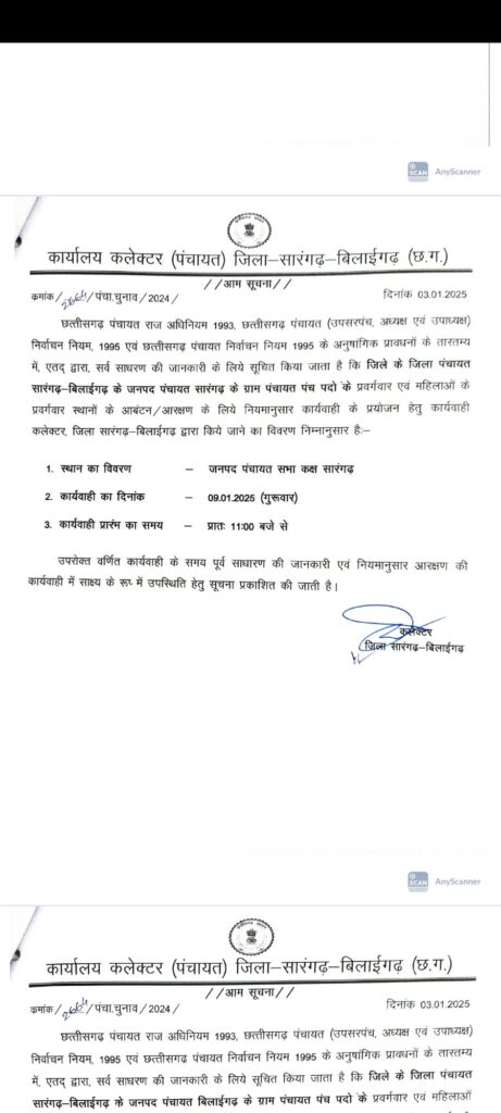 सारंगढ़ बिलाईगढ़ – जिला कलेक्टर ने नोटिफिकेशन जारी करते हुए त्रिस्तरिया आम चुनाव की आरक्षण तिथि जारी कर दिया है देखे कब और कहा होगा