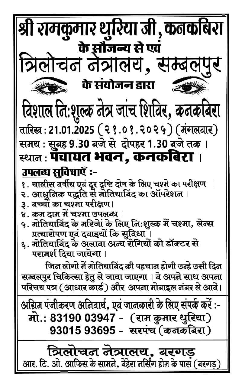 सारंगढ़। सारंगढ़ बिलाईगढ़ जिले के कनकबीरा में 21 जनवरी को सुबह साढ़े 9 बजे से 1 बजे तक निःशुल्क नेत्र जांच शिविर का आयोजन गोमर्डा क्षेत्र के प्रमुख समाज सेवी भाजपा मंडल अध्यक्ष रामकुमार थुरिया एवं त्रिलोचन नेत्रालय संबलपुर के संयोजन से किया जा रहा है जिसमें मोतियाबिंद से पीड़ित मरीजों का चिन्हांकन कर निःशुल्क आपरेशन भी कराया जायेगा ज्ञातव्य है की इसके पूर्व उनके जन्मदिन 6 अक्टूबर 2024 को भी उक्त शिविर आयोजित की गई थी जिसमें 30 बुजुर्गों का निःशुल्क आपरेशन कराकर आंखों में छाई अंधियारे को दूर करने में अपना योगदान दिया था इस संबंध में रामकुमार थुरिया ने जानकारी देते हुए बताया की जनसंपर्क के दौरान गांव में कई ऐसे बुजुर्ग मिले हैं जिनको आंखों में परेशानी है ठीक से देख नही पा रहे हैं कई क्षेत्रों से फिर से शिविर लगाने के लिए फोन आ रहे हैं उनकी भावनाओं को ध्यान में रखते हुए नेत्र जांच शिवीर का आयोजन किया गया है क्षेत्र प्रबुद्धजनों से निवेदन है की अपने गांव के मोतियाबिंद से पीड़ित लोगों को निःशुल्क नेत्र जांच शिविर की जानकारी दे कर अधिक से अधिक लोगों को लाभान्वित करने में सहयोग देने का आग्रह किया है।