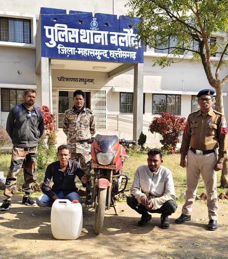 उड़ीसा तरफ से गाड़ी आने की सूचना पर ग्राम नयागांव पदमपुर से सरायपाली जाने वाली रोड़ पर जाकर मुखबिर के बताएं हुलिया के हिसाब से दो व्यक्तियों को रोक कर नाम पता पूछताछ करने पर (1) अपना नाम सुमंत बारीक पिता श्यामलाल बारिक उम्र 38 वर्ष साकिन सेमलिया पुलिस थाना बलौदा जिला महासमुंद छत्तीसगढ़ तथा दूसरा व्यक्ति (2) कमलेश भोई पिता विक्रम भोई उम्र 23 वर्ष साकिन तोरेसिंहा पुलिस थाना सरायपाली जिला महासमुंद छत्तीसगढ़ का होना बताया तथा सफेद रंग के प्लास्टिक बोरी में रखे सफेद कलर के 20 लीटर वाली जारिकेन में रखें वस्तु को चैकिंग करने पर महुआ शराब जैसा खुशबू आने पर उक्त दोनों बुक्तियो को महुआ शराब रखने का वैध दस्तावेज पेश करने को कहा गया जिस पर किसी प्रकार की कोई वैध दस्तावेज न पेश कर पाने पर उक्त मसूरका 20 लीटर महुआ शराब जुमला कीमती 4000 रुपए व बजाज पल्सर मोटरसाइकिल कीमती 35000 रु.को कुल जुमला कीमती 39000 हजार रू को जप्त कर आरोपियों का कृत्य धारा 34(2 )आबकारी एक्ट कायम कर आरोपियों को न्यायिक डिमांड पर भेजा दिया गया है,संपूर्ण कार्यवाही में बलौदा पुलिस का महत्वपूर्ण योगदान रहा ।