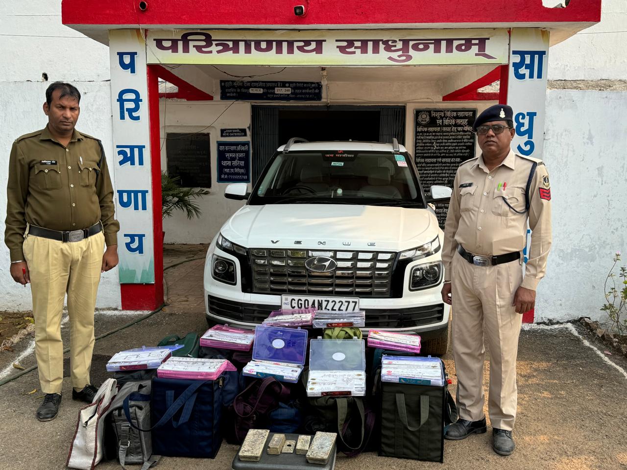 सरिया – सारंगढ़-बिलाईगढ़ के पुलिस अधीक्षक पुष्कर शर्मा के द्वारा जिले के सभी थाना/चौकी प्रभारियों को त्रिस्तरीय चुनाव के मद्देनजर संदिग्ध वाहनों की चेकिंग एवं अवैध कारोबार में संलिप्त व्यक्तियों के उपर कड़ी से कड़ी कार्यवाही करने निर्देशित किया गया है। इसी कड़ी में पुलिस अधीक्षक के निर्देशन में तथा अति० पुलिस अधीक्षक सारंगढ़-बिलाईगढ़ श्रीमती निमिषा पाण्डेय एवं उप पुलिस अधीक्षक सारंगढ़ श्री अविनाश मिश्रा के कुशल मार्गदर्शन में दिनांक 30.01.2025 को वाहन चेकिंग के दौरान एक हुण्डई वेन्यु कार से करीबन 212 किलोग्राम बिना बिल के चांदी के जेवरों के साथ 02 लोगो को पकड़ने में सफलता हासिल हुई है। कंचनपुर बेरियर के पास संदिग्ध वाहनों की चेकिंग के दौरान उडीसा की ओर से आ रहे एक सफेद रंग के हुंडई वेन्यू कार क्रमांक सीजी 04 एनजेड 2277 को रोका गया जिसमें दो व्यक्ति सवार थे जिनका नाम पता पूछने पर वाहन चालक ने अपना नाम पप्पू साहू पिता स्व० मंषाराम साहू उम्र 26 वर्ष निवासी विश्वकर्मा चौक साहू पारा वार्ड क्रमांक 14 मुजगहन (सेजबहार) थाना मुजगहन जिला रायपुर (छ०ग०) का होना बताया व बगल सीट में बैठा व्यक्ति रामरूची पटेल पिता जगन्ननाथ पटेल उम्र 38 वर्ष निवासी न्यू संतोषी नगर मुजगहन वार्ड क्रमांक 54 थाना मुजगहन जिला रायपुर (छ०१०) का होना बताये वाहन को चेक कराने हेतु कहने पर गोल-मोल जवाब देने लगे वाहन की तलाशी लेने पर वाहन के पीछे डिक्की में एवं पीछे सीट में कुल 22 नग नीला, काला, कत्था, हरा रंग के छोटे बड़े बैग एवं 01 सफारी कंपनी के अटैची के अंदर विभिन्न प्रकार के चांदी के आभूषण एवं 05 नग अलग-अलग साईज के चांदी के सिल्ली मिले पूछताछ करने पर दोनों के द्वारा उक्त चांदी के आभूषण को रायपुर से उडीसा होते हुये सरिया सारंगढ़ की ओर परिवहन करना बताये चांदी के आभूषण को रखने एवं परिवहन करने के संबंध में गवाहों के समक्ष 94 बीएनएसएस का नोटिस दिया जाकर वैद्य दस्तावेज पेश करने हेतु कहा गया दोनों के द्वारा किसी प्रकार का दस्तावेज नहीं होना बताया गया । उपरोक्त संदेहियों के संयुक्त कब्जे से विभिन्न प्रकार के चांदी के आभूषण एवं चांदी के सिल्ली कुल वजनी 212.600 किलोग्राम कीमती लगभग 1.91,60000 रू० रूपये एवं परिवहन में प्रयुक्त एक सफेद रंग का हुंडई वेन्यू कार क्रमांक सीजी 04 एनजेड 2277 कीमती करीबन 1500000रू० को धारा 106 बीएनएसएस के तहत् जप्त किया गया। जप्ती कार्यवाही की सूचना आयकर विभाग एवं जीएसटी विभाग को दी जाकर वैधानिक कार्यवाही की गई ।