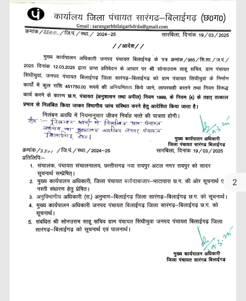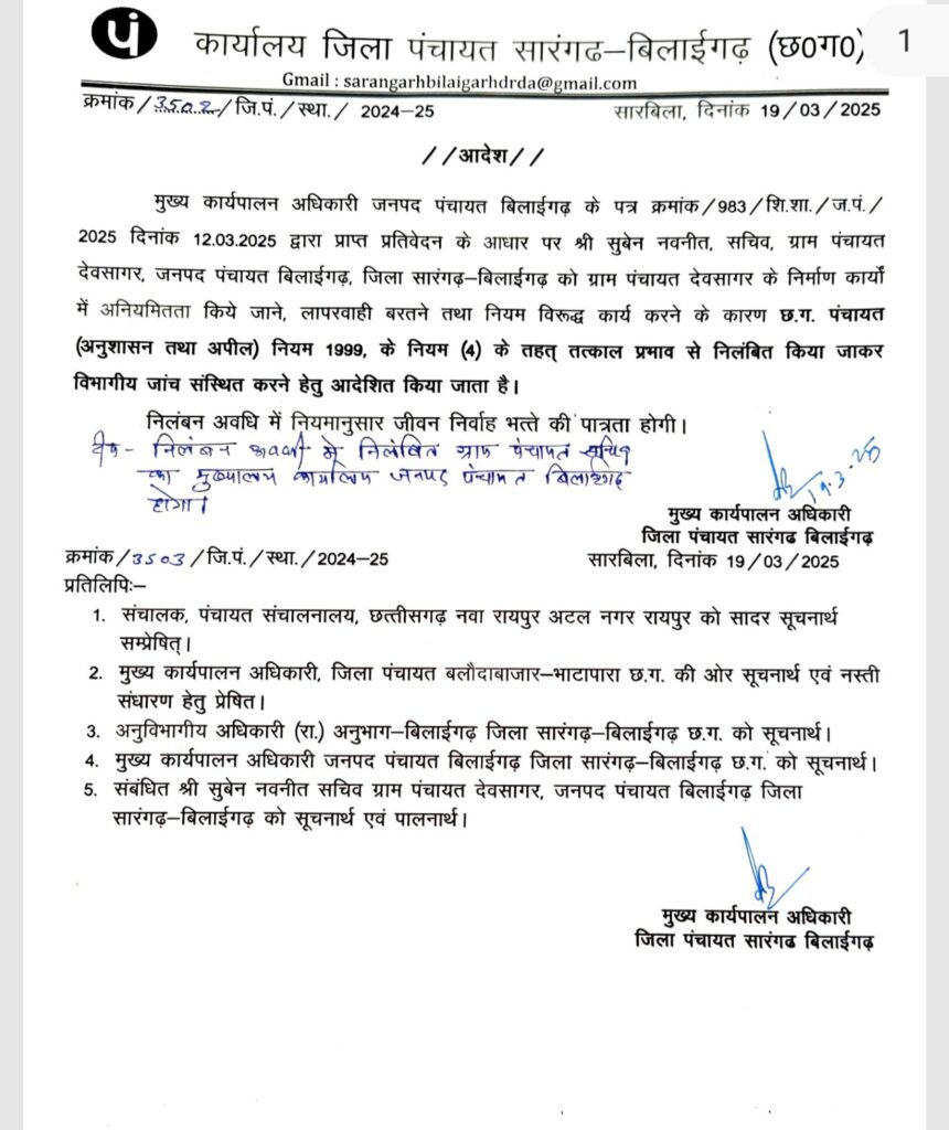 सारंगढ़ बिलाईगढ़, 20 मार्च 2025/मुख्यमंत्री विष्णु देव साय के शासन में सुशासन के लिए कलेक्टर धर्मेश कुमार साहू के निर्देशन में जिला पंचायत सारंगढ़ बिलाईगढ़ के मुख्य कार्यपालन अधिकारी इंद्रजीत बर्मन ने निर्माण कार्यों में अनियमितता पाए जाने पर ग्राम देवसागर के सचिव सुबेन नवनीत को, ग्राम सिंघीचुवा के सचिव सोनाऊ राम साहू को और ग्राम मुड़पार स के सचिव संतोष कुमार साहू को निलंबित किया है। साथ ही साथ विभागीय जांच गठित करने का आदेश जारी किया है। निलंबन अवधि में इन सचिवों को जीवन निर्वाह भत्ता नियम अनुसार दिया जाएगा।