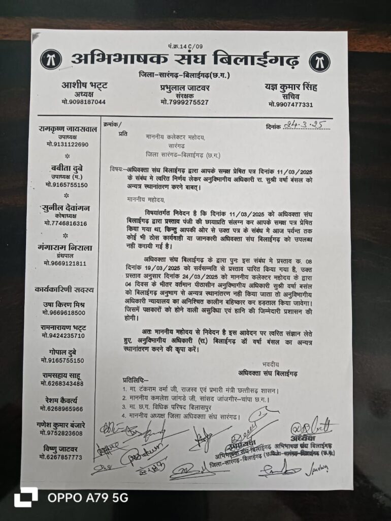 सारंगढ़ बिलाईगढ – बिलाईगढ़ एसडीएम डाक्टर वर्षा बंसल के खिलाफ़ बैठेंगे अधिवक्ता संघ हड़ताल पर अपको बता दे विगत कुछ दिनो से लगातार अधिवक्ता संघ नाराज़ चल रहे जिसको लेकर बिलाईगढ SDM को हटाने मांग किया था