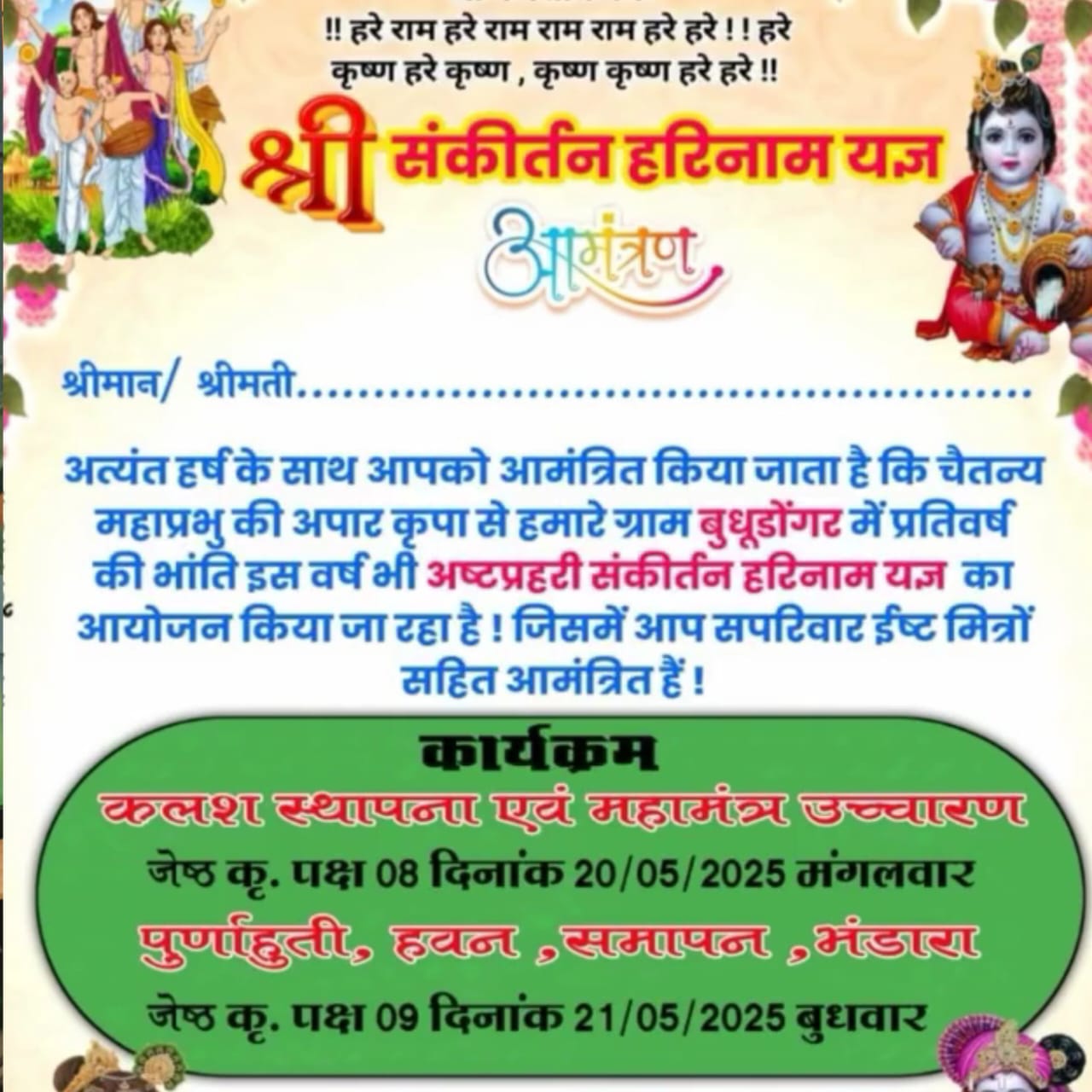 यह कार्यक्रम दिनांक 20.05.2025 दिन मंगलवार को कलश स्थापना एवं महामंत्र उच्चारण जाप से प्रारंभ होगा जिसमे आमंत्रित कीर्तन पार्टी है-
