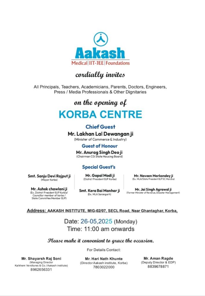 कोरबा के लोग मेडिकल, आईआईटी, जे ई ई, फाउंडेशन और अन्य (कोर्स) पढ़ाई करने घर से बहुत दूर रायपुर और अनेक बड़े शहरों में कोचिंग करने जाते थे अब वही पढ़ाई कोचिंग सेंटर कोरबा के निहारिका घंटा घर के पास हेलीपेड रोड में शुभारंभ होने जा रहा है, जिसका शुभारंभ सोमवार दिनांक 26 मई को मंत्री लखन लाल देवांगन, श्री मति संजू देवी राजपूत (मेयर कोरबा),गोपाल मोदी (जिला भाजपा अध्यक्ष),डॉ नवीन मारकंडे( पूर्व विधायक ),श्रीमती केरा बाई मनहर (पूर्व विधायक),अशोक चवलानी( पूर्व भाजपा जिलाध्यक्ष)जय सिंह अग्रवाल( पूर्व मंत्री) के गरिमामयी उपस्थिति में सम्पन्न होगा।