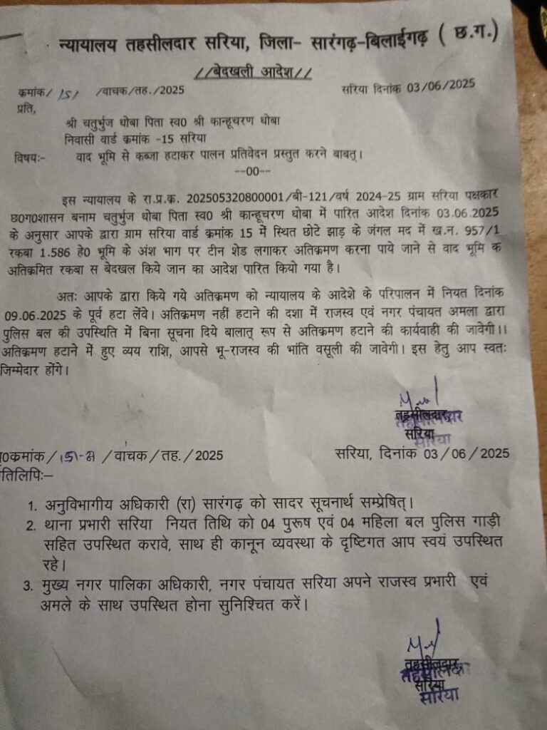 न्यायालय के रा.प्र.क्र. 202505320800001/बी-121/वर्ष 2024-25 ग्राम सरिया पक्षकार 80ग0 शासन बनाम चतुर्भुज धोबा पिता स्व० श्री कान्हूचरण थोबा में पारित आदेश दिनांक 03.06.2025 के अनुसार आपके द्वारा ग्राम सरिया वार्ड क्रमांक 15 में स्थित छोटे झाड़ के जंगल मद में ख.न. 957/1 रकबा 1.586 हे0 भूमि के अंश भाग पर टीन शेड लगाकर अतिक्रमण करना पाये जाने से वाद भूमि अतिक्रमित रकबा से बेदखल किये जाने का आदेश पारित किया गया है।