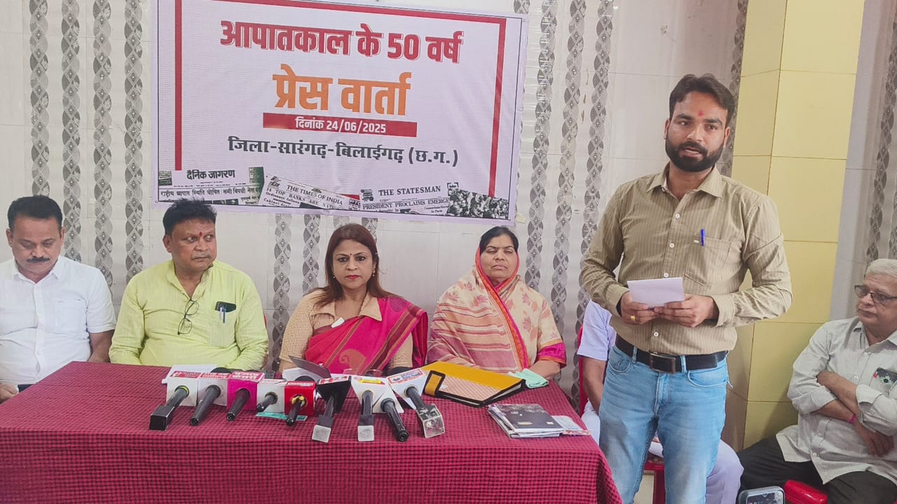 जिसमे श्रीमती हर्षिता पांडेय प्रदेश भाजपा प्रवक्ता व राज्य महिला आयोग पूर्व अध्यक्ष, ज्योति लाल पटेल जिला भाजपा अध्यक्ष, श्रीमती केराबाई मनहर पूर्व विधायक , संजय पांडे जिला पंचायत अध्यक्ष,भूवनलाल मिश्रा कार्यक्रम संयोजक, जगन्नाथ केशरवानी ,हरिनाथ खुंटे प्रदेश मंत्री अजा मोर्चा ,मनोज जायसवाल , अजेश अग्रवाल प्रेस वार्ता में शामिल रहे आपातकाल को लेकर भाजपा प्रवक्ता हर्षिता पांडेय ने गांधी परिवार को जमकर निशाना साधा कहा भारत की हर एक नागरिक को आपातकाल के बारे में जानने की जरूरत है कांग्रेस किस हद तक गिर सकती है सता में रहने के लिए देश में आपातकाल लगा दिया न जाने कितने निर्दोष लोगों को सलाखें के पीछे डाल दिया