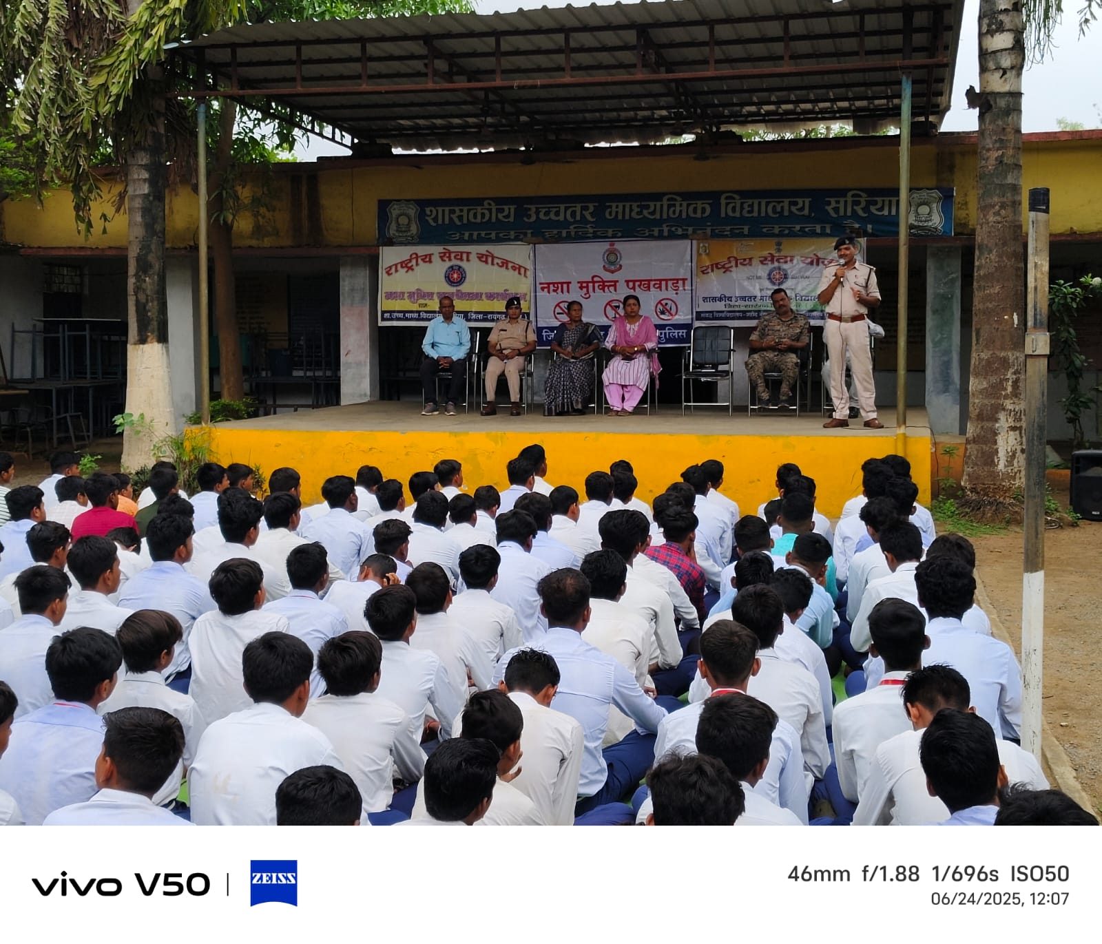 सरिया -आज दिनांक 24/06/ 2025 को नशा मुक्ति पखवाड़ा अभियान के तहत थाना सरिया पुलिस के द्वारा शासकीय उच्चतर माध्यमिक विद्यालय (बालक) सरिया जाकर स्कूल के छात्रों एवं शिक्षकों को नशापान नहीं करने के संबंध में समझाइस दी गई साथ ही उन्हें नशा नहीं करने के संबंध में शपथ दिलाया जाकर लिंक के माध्यम से फ़ोन पर प्रमाण पत्र डाउनलोड कराया गया । इस अवसर पर लगभग 100 विद्यार्थी एवं स्टाफ उपस्थित रहे।