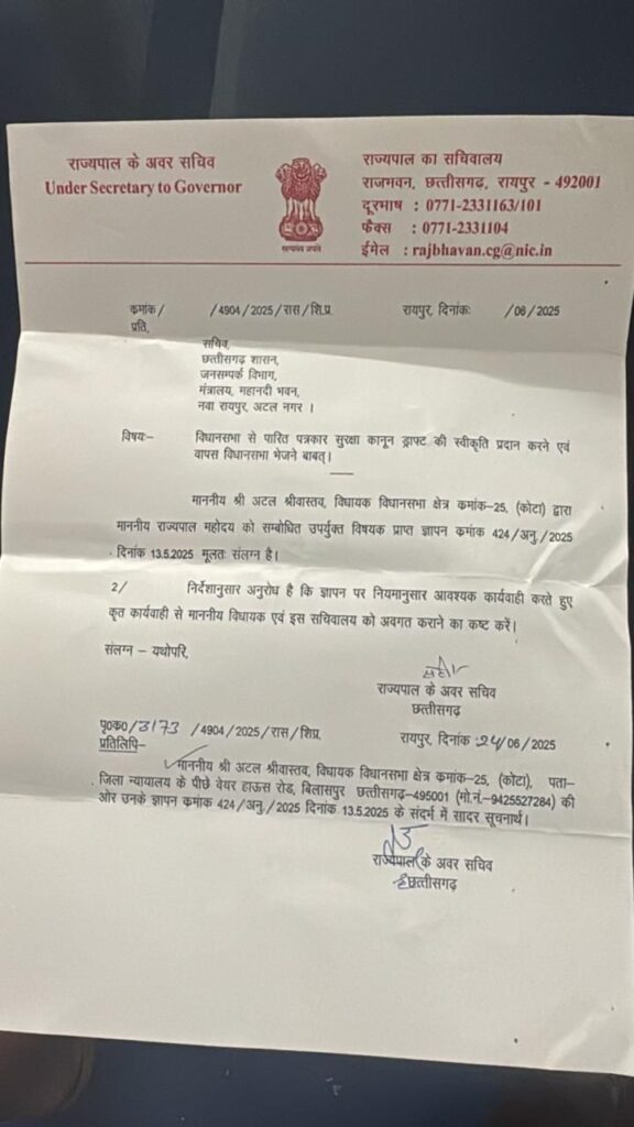 पत्रकार सुरक्षा कानून को लेकर बिलासपुर विधायक अटल श्रीवास्तव के पत्र पर राज्यपाल ने छत्तीसगढ़ शासन को लिखा खत।