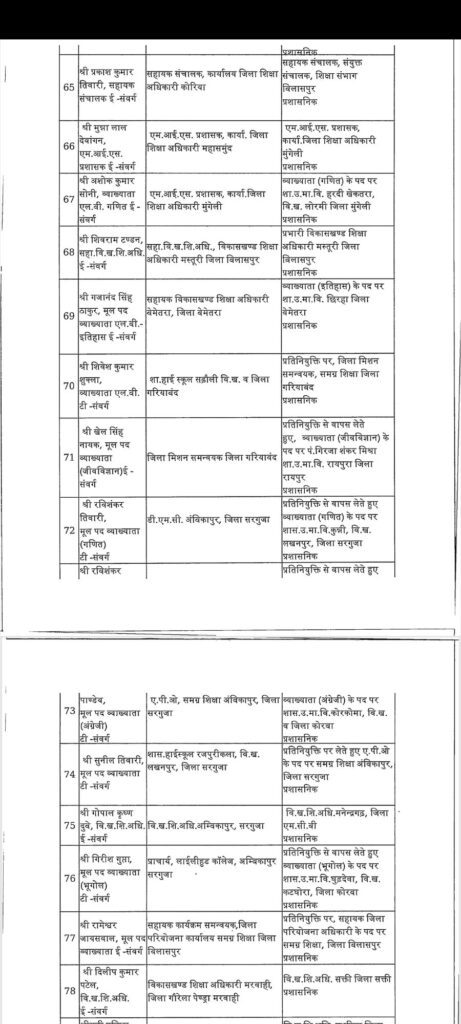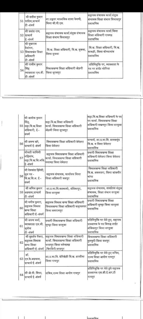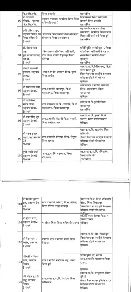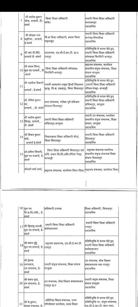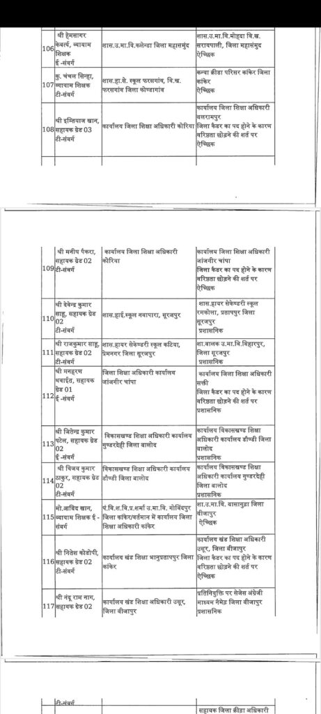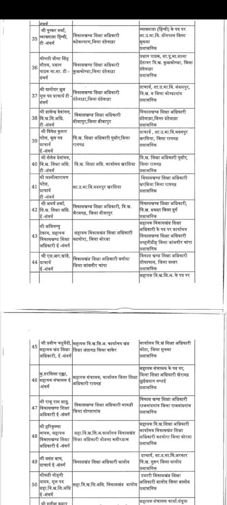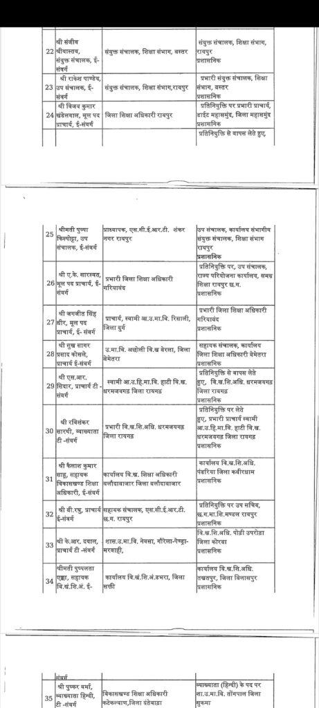 सारंगढ़ – छत्तीसगढ़ में तबादला की एक और सुची जारी हुआ इस बार शिक्षा विभाग में बड़ा फेरबदल किया गया है पूरे प्रदेश के जिलों में कई अधिकारी कर्मचारी का तबादला हुआ है लगभग 183 अधिकारी कर्मचारी बदले गए है पूरे प्रदेश में वहीं अगर सारंगढ़ बिलाईगढ़ जिले की बात करे तो लगातार कई जिला शिक्षा अधिकारी बदले गए है अभी हाल ही मे एल पी पटेल निलंबित किया गया था उसके बाद से डीईओ की कामन प्रभार के रूप में रायगढ़ के जिला शिक्षा अधिकारी संभाल रहे थे लेकिन अब फिर से बदल दिया गया है अब नया जिला शिक्षा अधिकारी होगें जे आर डहरिया जो कि पहले बसना में ब्लॉक शिक्षा अधिकारी के रूप में पदस्त थे देखे पूरी सुची की किनको कहा क्या बनाया गया