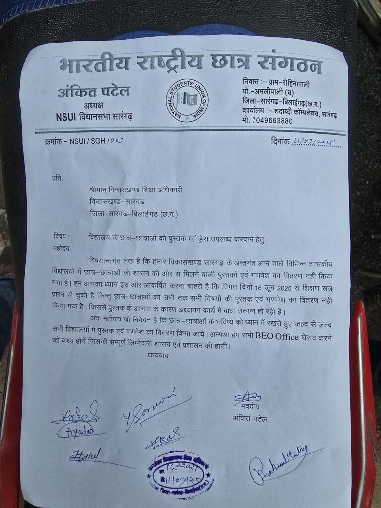 सारंगढ़ – नए शिक्षा सत्र का प्रारम्भ हो चुका है लेकिन अभी तक शासकीय स्कूलों में शासन से प्राप्त होने वाली पुस्तकें एवं गणवेश (ड्रेस ) का वितरण नहीं हो पाया है जिसके संदर्भ में एन.एस.यू.आई जिलाध्यक्ष अभिषेक शर्मा के निर्देशानुसार एन.एस.यू.आई विधानसभा अध्यक्ष अंकित पटेल ने एन.एस.यू. आई के साथियों के साथ विकास खंड शिक्षा अधिकारी सारंगढ़ को ज्ञापन सौंपकर जल्द से जल्द सभी स्कूलों में पुस्तके एवं गणवेश प्रदान करने की मांग की गई है।