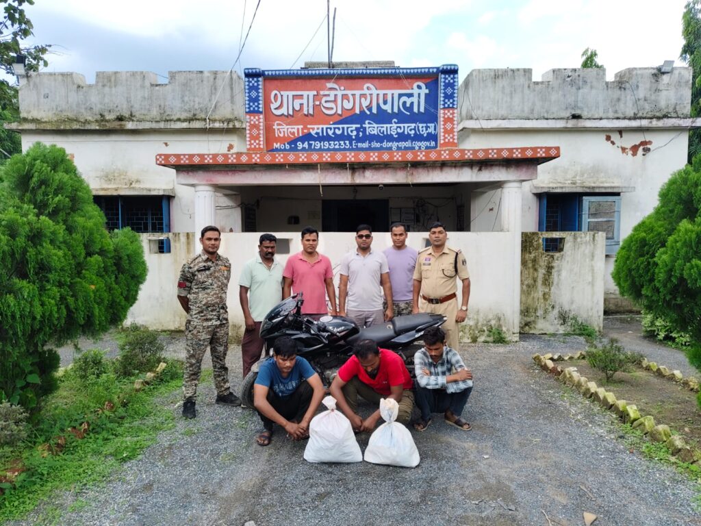 बरमकेला -पुलिस अधीक्षक आंजनेय वार्ष्णेय के द्वारा जिले के सभी थाना/चौकी प्रभारियों को जुआ, सट्टा, शराब, अवैध मादक पदार्थ गांजा में संलिप्त व्यक्तियों के उपर कड़ी से कड़ी कार्यवाही करने की निर्देश पर अति0 पुलिस अधीक्षक श्रीमती निमिषा पाण्डेय एवं उप पुलिस अधीक्षक मुख्यालय सारंगढ़ अविनाश मिश्रा के कुशल मार्गदर्शन में थाना प्रभारी भगवती प्रसाद कुर्रे के नेतृत्व मे आज दिनांक 10/07/2025 को जरिये मुखबीर सुचना पर ग्राम डोंगरीपाली स्कूल के पास मेन रोड में घेराबंदी कर मोटर सायकल में आ रहे 03 संदिग्ध व्यक्तियों के कब्जे से बैग में रखा हुआ 03 पैकेट मादक पदार्थ गांजा कुल 03 किलो 30 ग्राम एवं घटना मे प्रयुक्त 02 नग मोबाईल एवं एक काला रंग की पल्सर मोटर सायकल जुमला किमती लगभग 119500 रूपये को जप्त कर धारा 20 बी ,29 NDPS ACT के तहत विधिवत कार्यवाही कर *आरोपीगण के विरूद्ध *थाना डोंगरीपाली मे धारा 20 बी ,59 NDPS ACT का अपराध पंजीबद्ध कर आरोपीगणों को न्यायिक रिमांड पर जेल भेजा गया है। *सम्पूर्ण कार्यवाही मे सउनि भगवती प्रसाद कुर्रे थाना प्रभारी डोंगरीपाली, प्र.आर. 115 रामदयाल लकडा, आरक्षक चंद्रकांत भारद्वाज , अविनाश टंडन,चंद्र कुमार चंद्रा,चक्रधर सिदार, सुदर्शन राणा, किरण यादव एवं समस्त स्टाफ का विशेष योगदान रहा।*