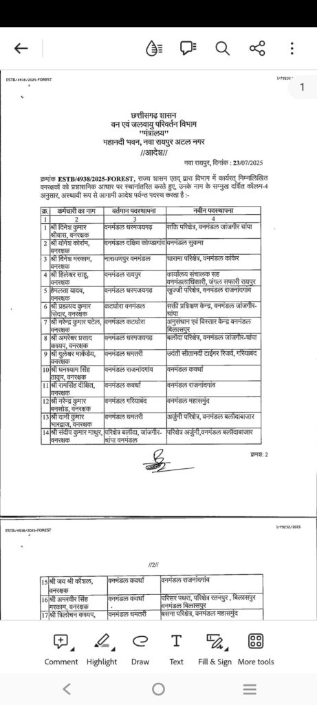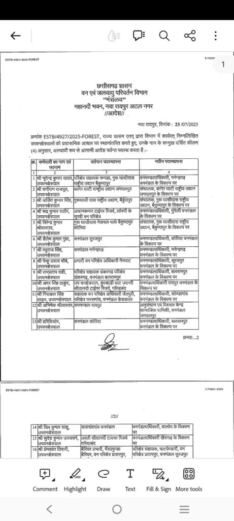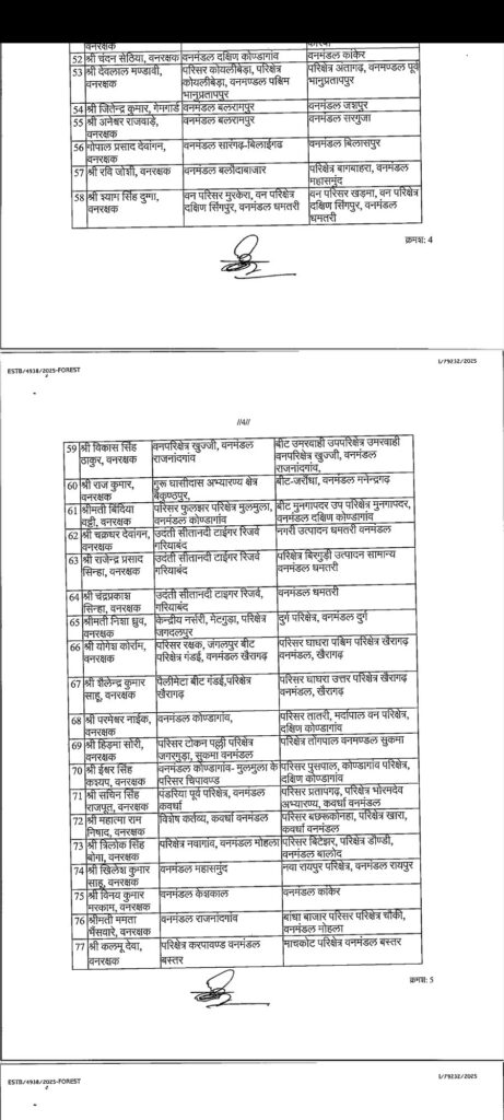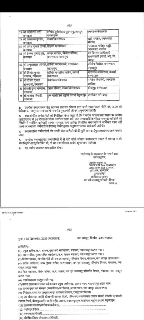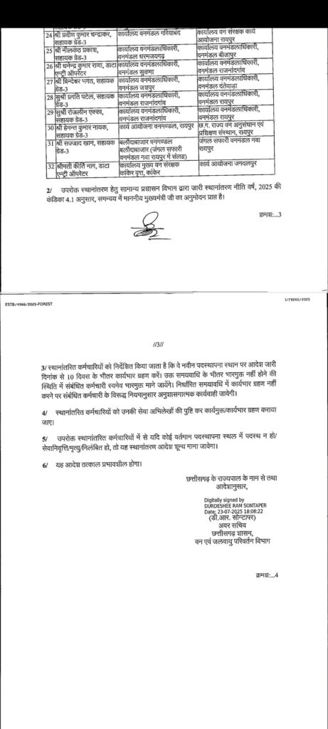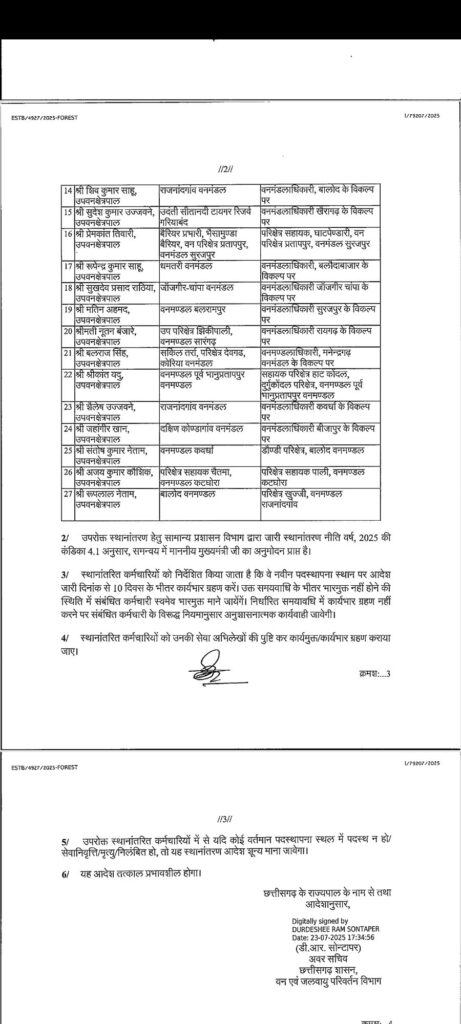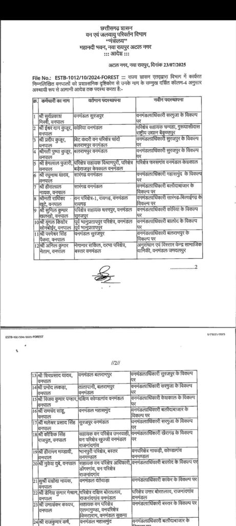 सारंगढ़ बिलाईगढ़ – छत्तीसगढ़ शासन वन एवं जलवायु परिवर्तन विभाग ने इस बार तबादला की सुची जारी किया है जिसमें एक नहीं पूरे प्रदेश के विभिन्न जिलों के 200 से अधिक अधिकारी कर्मचारी का तबादला किया गया है देखे कौन किस जिला में कहा किसकी पोस्टिंग हुई है