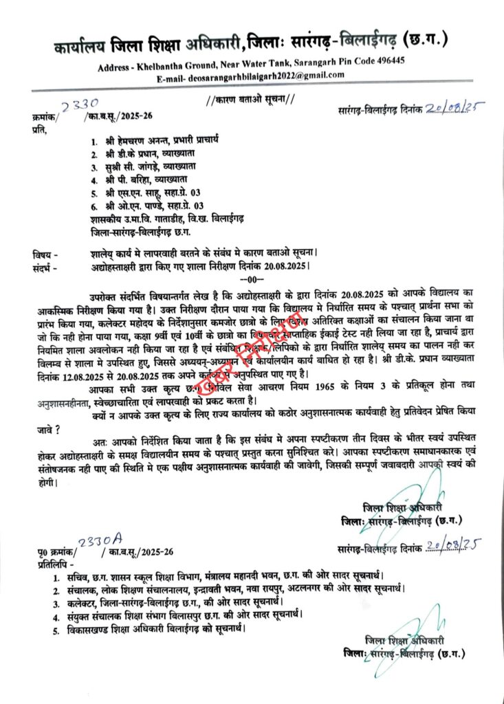 आपको बता दे 20.08.2025 शासकीय उच्चतर माध्यमिक शिक्षा गाताडीह जिला शिक्षा अधिकारी विद्यालय का आकस्मिक निरीक्षण किया गया है। इस निरीक्षण दौरान पाया गया कि विद्यालय मे निर्धारित समय के पश्चात् प्रार्थना सभा को प्रारंभ किया गया, कलेक्टर महोदय के निर्देशानुसार कमजोर छात्रो के लिए विशेष अतिरिक्त कक्षाओं का संचालन किया जाना था जो कि नही होना पाया गया, कक्षा 9वीं एवं 10वीं के छात्रो का विषयवार साप्ताहिक ईकाई टेस्ट नही लिया जा रहा है, प्राचार्य द्वारा नियमित शाला अवलोकन नही किया जा रहा है एवं संबंधित शिक्षक/लिपिको के द्वारा निर्धारित शालेय् समय का पालन नहीं कर विलम्ब से शाला मे उपस्थित हुए, जिससे अध्ययन्-अध्यापन एवं कार्यालयीन कार्य बाधित हो रहा है। श्री डी. के. प्रधान व्याख्याता दिनांक 12.08.2025 से 20.08.2025 तक अपने कर्तव्य से अनुपस्थित पाए गए है।