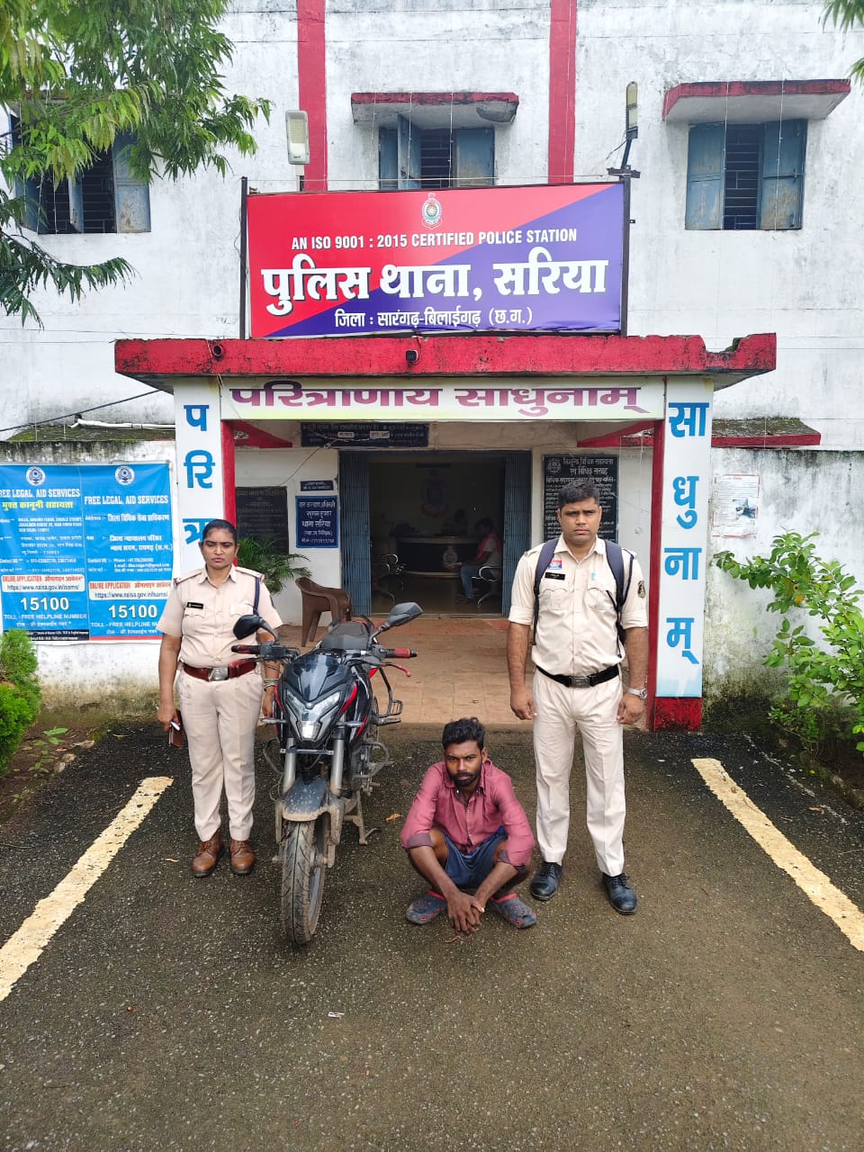 प्रार्थी अविनाश धागड निवासी सरिया ने दिनांक 19/8/2025 को थाना में रिपोर्ट दर्ज कराया था कि दिनांक 14 8.2025 को शराब दुकान सरिया के सामने से उसके मोटर सायकल पल्सर क्र CG13 BE 2990 को कोई अज्ञात व्यक्ति द्वारा चोरी कर लिया गया है कि प्रार्थी की सूचना पर थाना सरिया में अपराध पंजीबद्ध कर विवेचना में लिया गया था।दौरान विवेचना आज दिनांक 20/8/2025 को भटली चौक सरिया में वाहन चेकिंग करते समय आरोपी सूरत चौहान पुलिस को देखकर भागने लगा जिसे दौड़ाकर पकड़ा गया।आरोपी के कब्जे से चोरी गया मोटर सायकल पल्सर CG 13 BE 2990 बरामद किया गया। आरोपी से पूछताछ करने पर घटना दिनांक 14/8/2025 को शराब दुकान सरिया के सामने से मोटरसाइकिल पल्सर क्र CG13 BE 2990 को चोरी करना स्वीकार किया।आरोपी से मोटरसाइकिल को जप्त कर आरोपी को गिरफ्तार कर न्यायिक रिमांड पर जेल भेजा गया है।