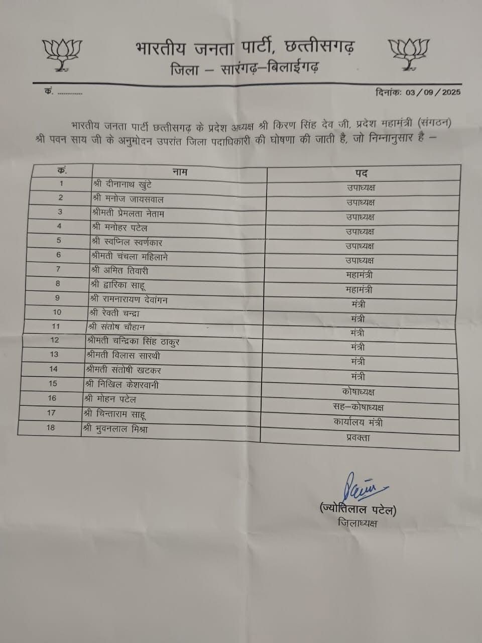 सारंगढ़ – भारतीय जनता पार्टी संगठन की मजबूरी और विस्तार करने में लगी हुई है धीरे धीरे प्रदेश के तमाम जिलों में जिला बॉडी का गठन और नई जिम्मेदारियों के साथ अनुभवी कार्यकर्ताओं को जिम्मेदारी दे रही आज सारँगढ बिलाईगढ़ जिले का भी घोषणा किया गया है जिसमें जिले के भाजपा में 18 लोगो की मिली है जिम्मेदारी, यह सूची भारतीय जनता पार्टी छत्तीसगढ़ के प्रदेश अध्यक्ष किरण सिंह देव और प्रदेश महामंत्री पवन साय (संगठन) के अनुमोदन पर जारी किया गया है जिला में भारतीय जनता पार्टी के जिला अध्यक्ष की घोषण करने के बाद काफ़ी दिनों तक रुका हुआ था ज्योति पटेल को जिला अध्यक्ष बनाया गया था और अब उनकी जिला टीम का भी विस्तार कर लिया गया है देखे सूची