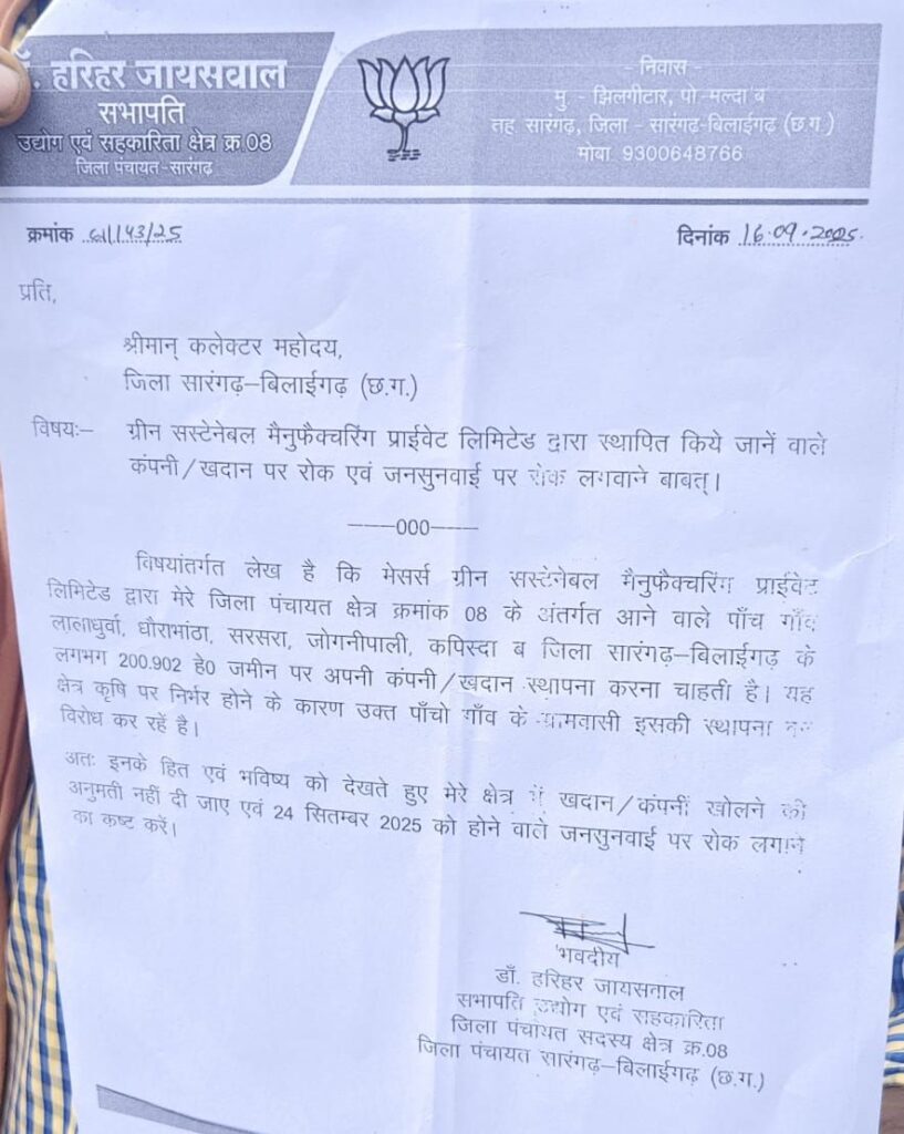 जिला पंचायत उधोग सभापति ने लेटर पेड में जनसुनवाई रोकने ज्ञापन सौपा है जिसमे उल्लेखनीय है सारंगढ़ बिलाईगढ़ जिले के सारंगढ़ विकासखंड के अंतर्गत आने वाला ग्राम पंचायत धौराभाठा, सरसरा, जोगनीपाली, कपिसदा ब,लालाधुर्वा, इन पांचो गांव मे ग्रीन सस्टेनेबल मैनुफैक्चरिंग प्राईवेट लिमिटेड द्वारा स्थापित किये जानें वाले कंपनी खदान का 24 सितम्बर 2025 में होने वाली जनसुनवाई पर रोक लगवाने के लिए आज सैकड़ो ग्रामीण कलेक्टर दफ़्तर पहुचे थे