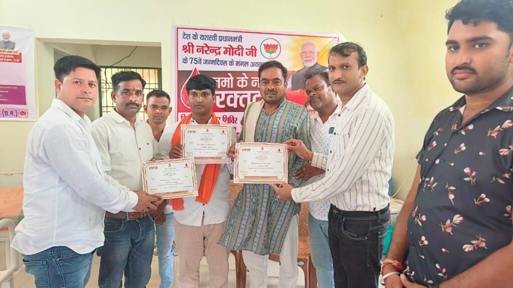 सरिया -भारत के प्रधानमंत्री श्री नरेन्द्र मोदी जी का 75 वां जन्मदिवस पर भारतवर्ष के वो समस्त राष्ट्रवादी लोग और जो भारत की उन्नति और प्रगति चाहते हैं वो सब हृदय से अलग-अलग जगहों पर रक्तदान शिविरों का आयोजन करके मोदी जी के जन्मदिन को सेवा पखवाड़ा के रूप में मनाया और परमात्मा से प्रार्थना किया कि नरेन्द्र मोदी जी को ऐसा सामर्थ्य प्रदान करें, जिससे वे अपने जीवन काल में सौ शरद ऋतुओं का दर्शन कर सकें..!!