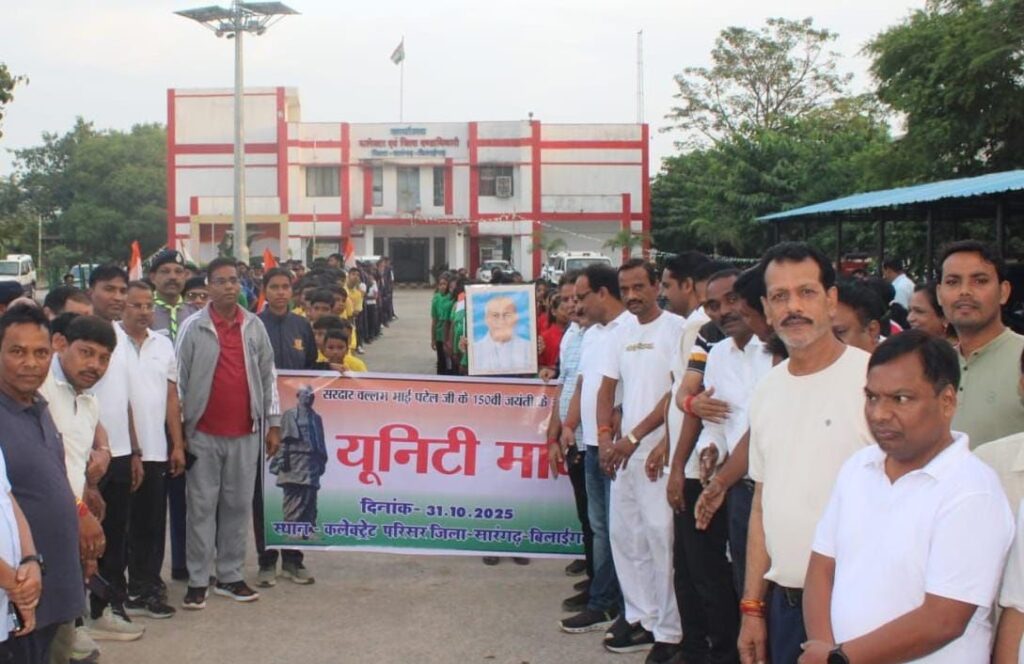 सारंगढ़ बिलाईगढ़, 31 अक्टूबर 2025/सरदार वल्लभभाई पटेल की 150वीं जयंती पर युवाओं में राष्ट्रीय गौरव एवं एकता की भावना जागृत करने हेतु ‘‘यूनिटी मार्च’’ अंतर्गत दौड़ का आयोजन प्रातः 6.30 बजे कलेक्ट्रोरेट सारंगढ़ से खेलभांठा मैदान तक किया गया। इसमें बड़ी संख्या में स्कूली बच्चे, शिक्षक, स्काउट गाइड, एनसीसी एनएसएस आदि के बच्चे उपस्थित थे।