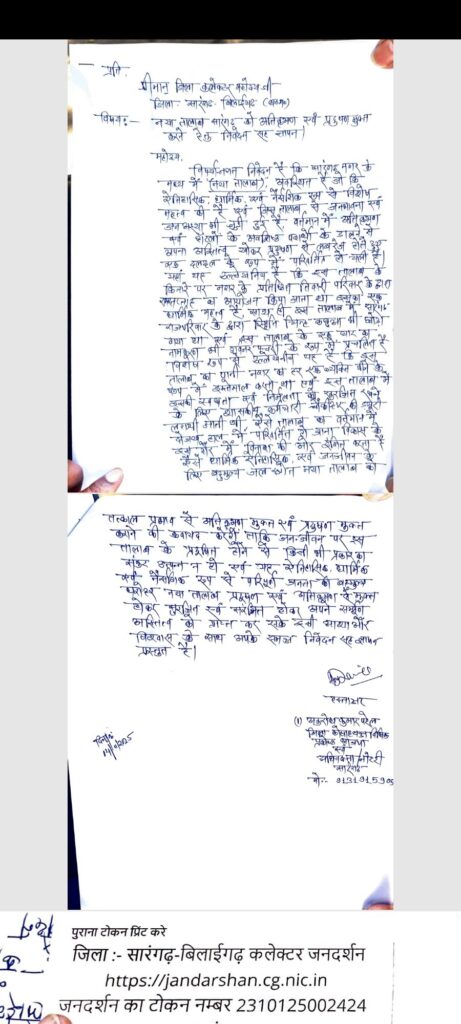 जन सुनवाई मिले आवेदन पर जिला कलेक्टर डॉक्टर संजय कौन्नजे ने त्वरित संज्ञान लेते हुए सारंगढ़ नगर पालिका अधिकारी सीएमओ और अनुविभागीय अधिकारी राजस्व एसडीएम को मार्किंग किया है!