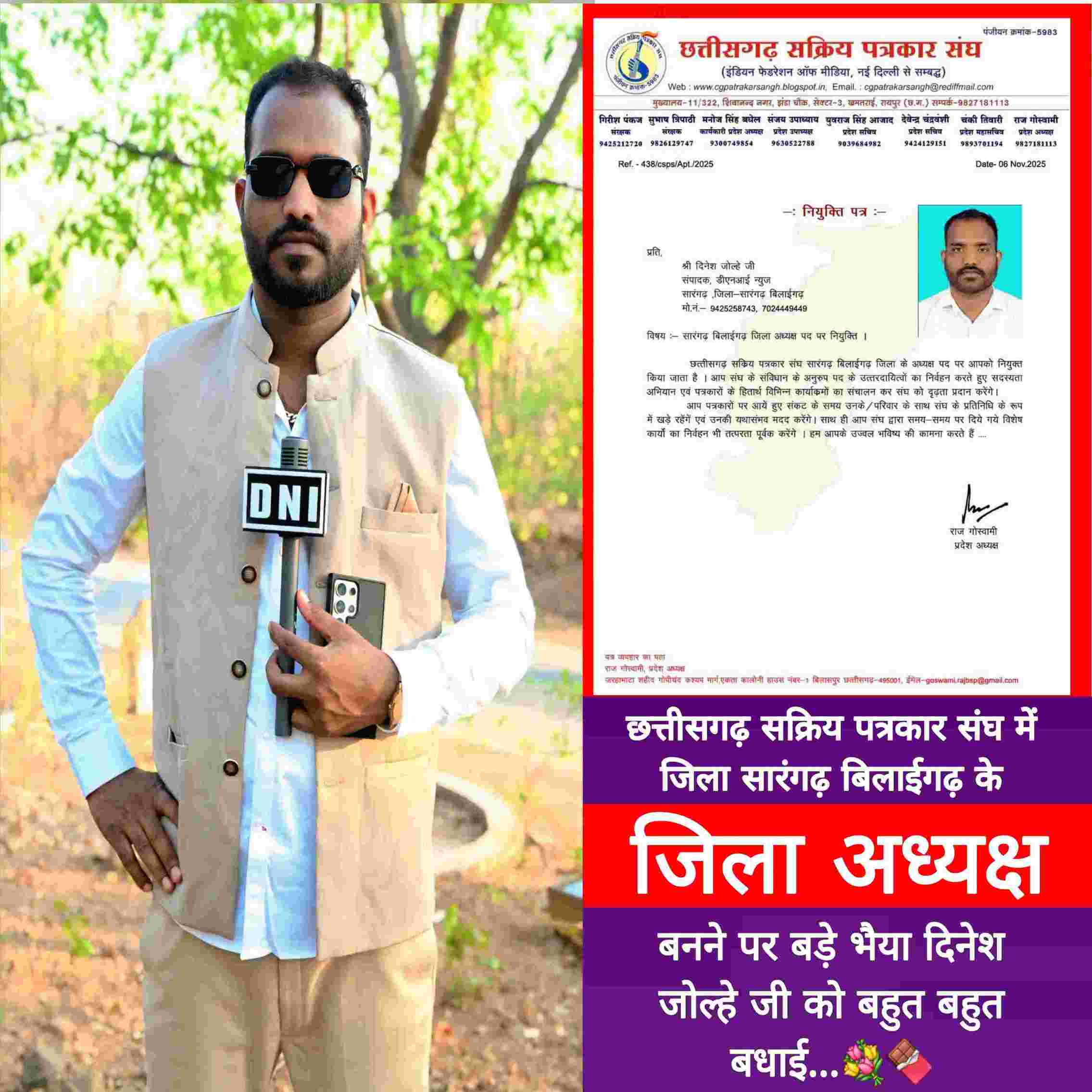 सारंगढ़-बिलाईगढ़ जिले के पत्रकार दिनेश जोल्हे को जिला अध्यक्ष बनाए जाने पर पूरे क्षेत्र में हर्ष की लहर है। उनके इस नियुक्ति पत्र के जारी होने के बाद से ही पत्रकारिता जगत में उन्हें लगातार शुभकामनाएँ मिल रही हैं।