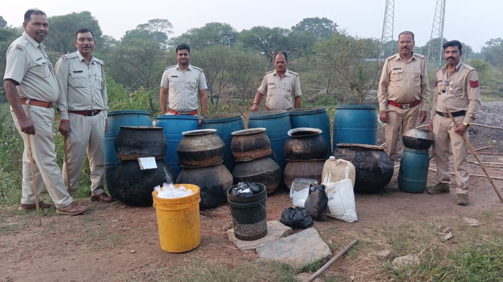 सारंगढ़ – आबकारी आयुक्त आर संगीता मैम के निर्देश के तारतम्य में कलेक्टर श्री संजय कन्नौजे एवं जिला आबकारी अधिकारी श्री संतराम वर्मा जिला सारंगढ़ -बिलाईगढ़ के मार्गदर्शन में दिनांक 06/11/2025 को ग्राम गस्त के दौरान मुखबिर से आबकारी विभाग वृत्त कोसीर को सूचना मिली की ग्राम पंहदा साबरिया डेरा में नाले के पास भारी मात्रा में अवैध कच्ची महुआ शराब का निर्माण किया जाता है जिसे गांव के बाहर नाले के पास एवम आसपास के क्षेत्रों में इसको विक्रय किया जाता है l सूचना की पुष्टि होने पर टीम के साथ बताए गए स्थान नाले के पास पहुंचे वहा पर मदिरा शराब बनाने हेतु भट्टी के साथ मदिरा पैक करने हेतु पॉलीथिन के पाउच,पॉलीथिन की छोटी छोटी 200 नग झिल्लियों प्रत्येक में भरी 200-200 मिलीलीटर ,02 नग सफेद रंग के जरीकेन में भरा 20-20 लीटर एवं 01 नीले रंग के जरीकेन में भरा 30 लीटर इस तरह कुल 110 लीटर कच्ची महुआ शराब तथा 07 नग बड़े नीले रंग के ड्रम में भरे महुआ शराब बनाने के लिए सड़ाकर बनाया गया महुआ लाहन प्रत्येक में भरा 200-200 किलोग्राम जिसकी कुल मात्रा लगभग 1400 किलोग्राम है को जब्त किया गया। कच्ची महुआ शराब को कब्जा आबकारी लिया गया एवम विधिवत रूप से महुआ लाहन का नष्टीकरण किया गया है l अज्ञात आरोपी के विरुद्ध छत्तीसगढ़ आबकारी अधिनियम धारा 34(1)(क) (च)34(2) का , प्रकरण कायम कर विवेचना में लिया गया है आरोपियों की पतासाजी की जा रही है l