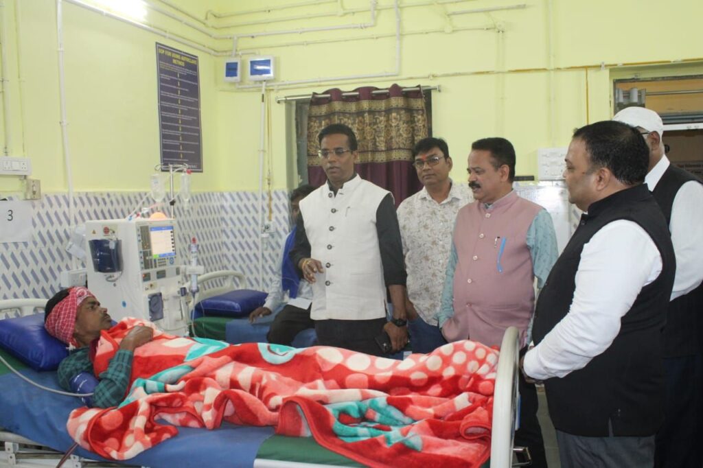 सारंगढ़ में डायलिसिस सुविधा होने से अब मरीजों को नहीं जाना पड़ रहा रायपुर, बिलासपुर कलेक्टर ने अस्पताल परिसर में इलाजरत किशोर बालक का हालचाल जाना और डॉक्टरों को उनके अच्छे देखभाल के निर्देश दिए। इसी प्रकार कलेक्टर ने डायलिसिस कक्ष में डायलिसिस करा रहे जिले के गांव सिंघनपुर और करबाडबरी के युवाओं से स्वास्थ्य सुविधा के बारे में पूछा। दोनों युवाओं ने जिले में डायलिसिस की सुविधा होने पर कहा कि अब उन्हें डायलिसिस के लिए बाहर रायगढ़, रायपुर, बिलासपुर जाने की जरूरत नहीं है। इस अवसर पर जिला पंचायत अध्यक्ष संजय भूषण पांडेय, अरविंद हरिप्रिया, अविनाश पुरी आदि उपस्थित थे। *जिला चिकित्सालय सारंगढ़ में