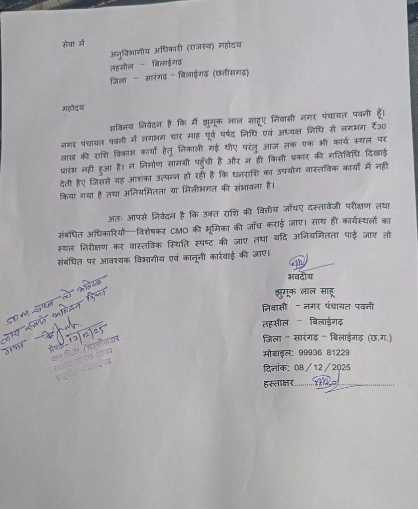 नगर पंचायत पवनी में अध्यक्ष निधि और पार्षद निधि से लगभग 30 लाख रुपये चार से पाँच माह पूर्व आहरित किए जाने के बावजूद अब तक किसी भी प्रकार का विकास कार्य शुरू नहीं होने का मामला तूल पकड़ता जा रहा है। इस संबंध में पवनी निवासी झुमुक लाल साहू ने अनुविभागीय अधिकारी को विस्तृत शिकायत सौंपी है।