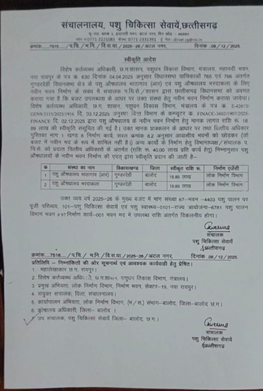 बलोद -गुण्डरदेही क्षेत्र के भाटागांव (आर) एवं भरदाकला ग्राम में पशु औषधालय के लिए नवीन भवन निर्माण की स्वीकृति प्रदान की गई है। यह स्वीकृति ग्रामीणों, स्थानीय जनप्रतिनिधियों एवं कार्यकर्ताओं की मांग पर जिला अध्यक्ष चेमन देशमुख के निरंतर प्रयासों से संभव हो पाई है।