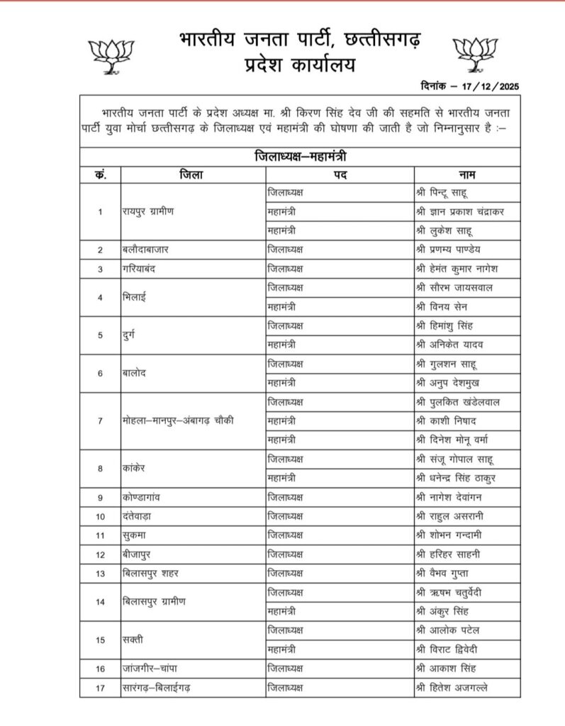 सारँगढ़-प्रदेश भर में भाजपा युवा मोर्चा जिलाध्यक्ष की घोषणा की गई जिसमे सारँगढ़ बिलाईगढ़ जिले की बात करे तो दर्जनों दावेदार जिला अध्यक्ष की रेश में भाग रहे थे जिसमें सबको पछाड़ते हुए आगे निकले हितेश अजगल्ले आज भाजपा प्रदेश अध्यक्ष किरण सिंह देव की सहमति से छत्तीसगढ़ के तमाम जिलों की जिला अध्यक्ष और जिला महामंत्रीयो की घोषणा की है देखे पूरी सूची