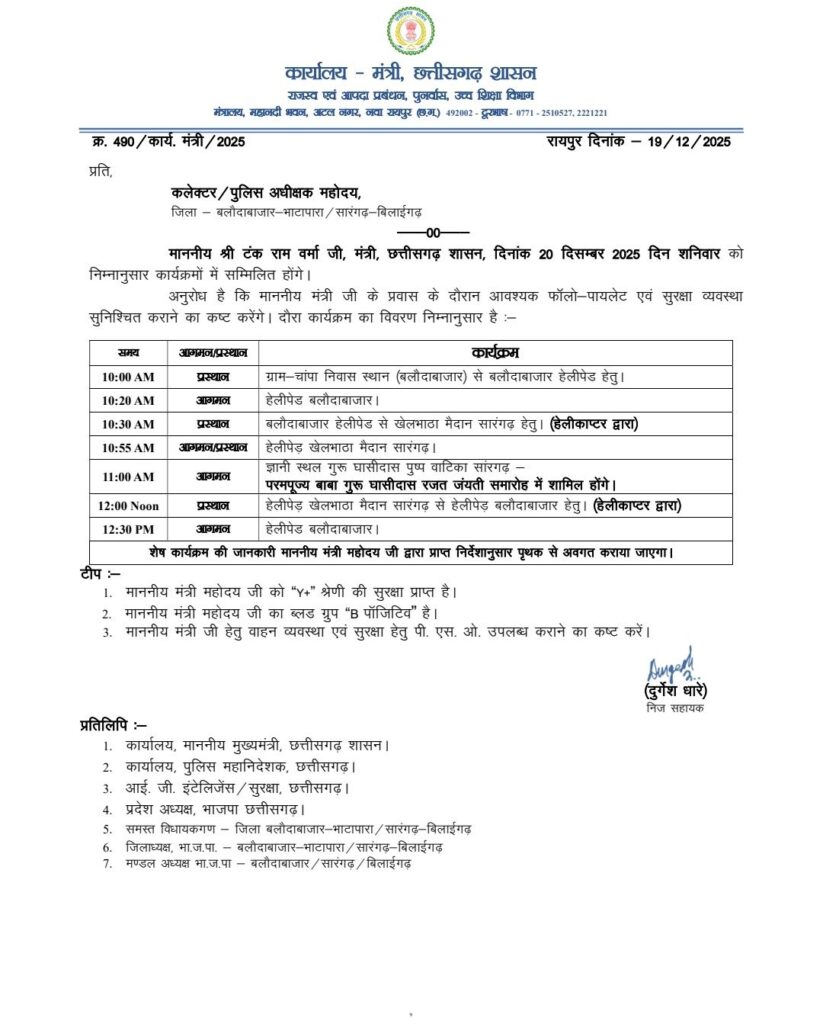 दोपहर 12:30 बजे: बलौदाबाजार हेलीपैड वापसी।